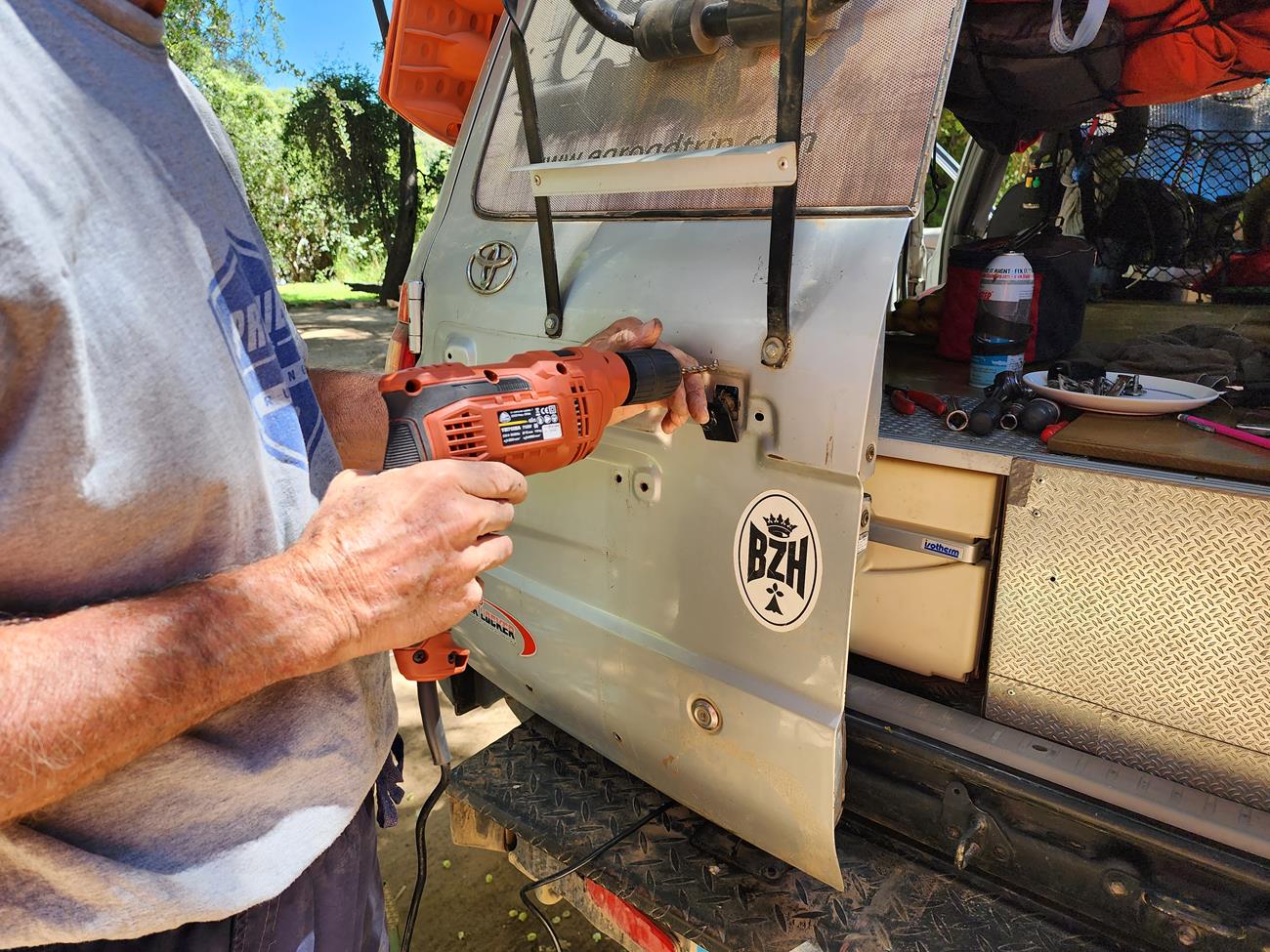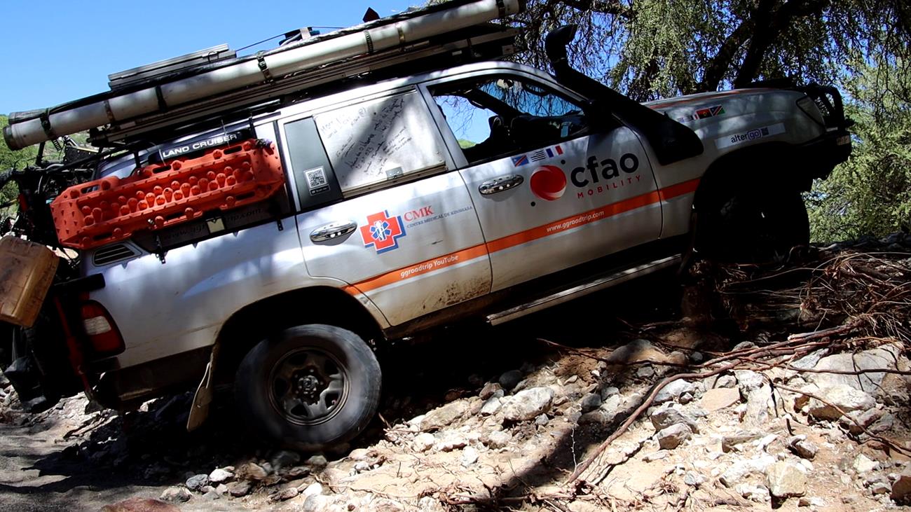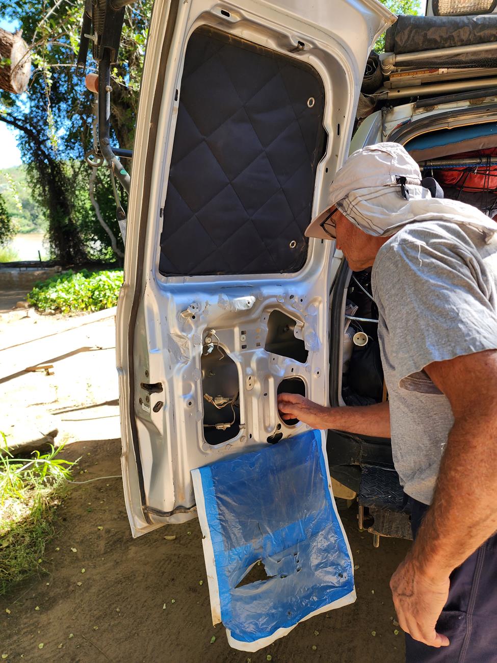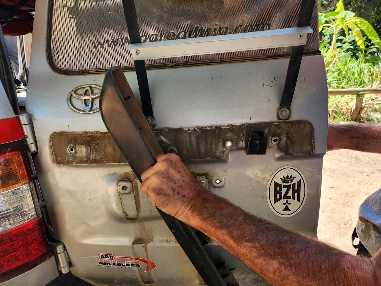 Yannick tente à nouveau d’ouvrir la porte et là c’est cata. Impossible, elle est coincée de chez coincée. Il commence à m’expliquer qu’il va devoir jouer de la disqueuse pour couper la porte et avoir accès au mécanisme. Avant tout ça nous devons trouver un lodge. À 5 km il y a le Kunene Lodge, sauf qu’ils ne font pas lodge, mais juste des emplacements.