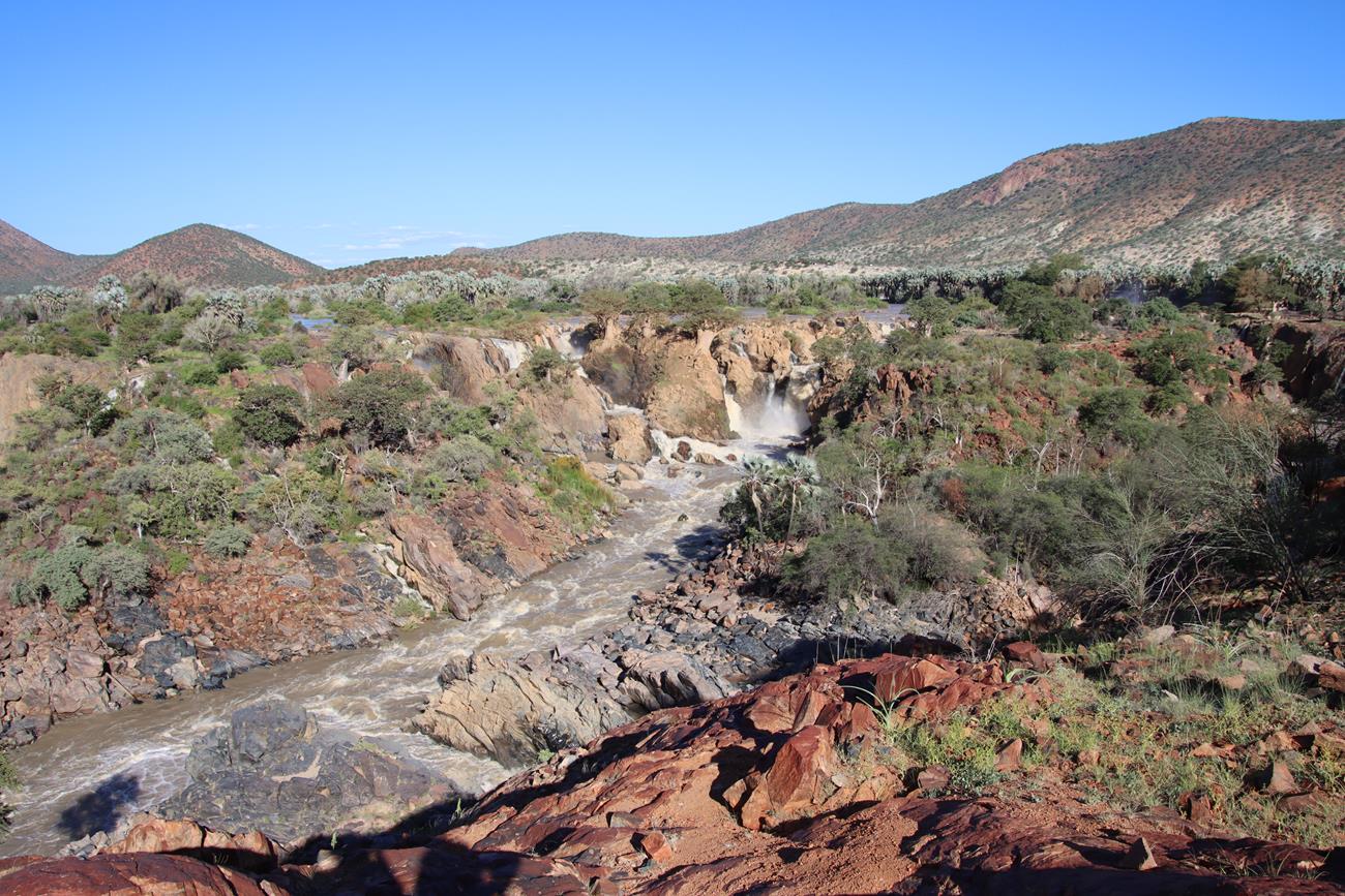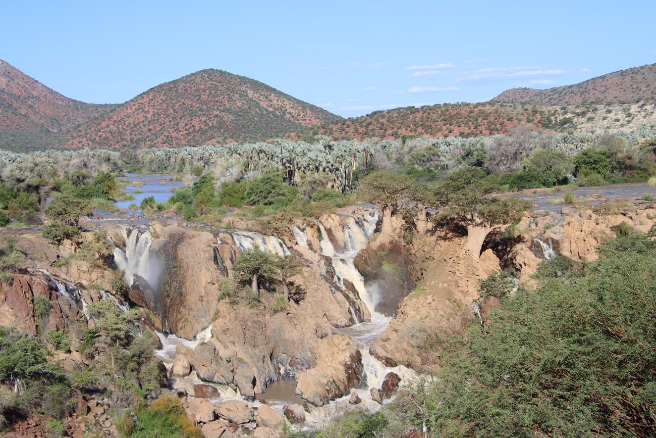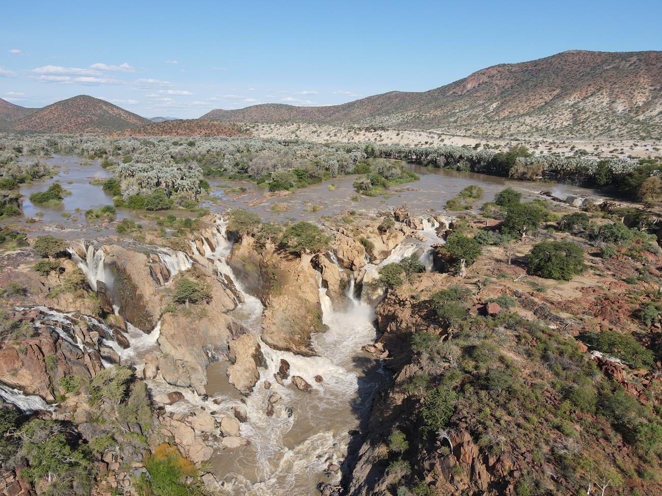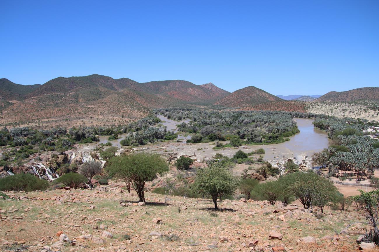 La Kunene, cette belle rivière prend sa source en Angola et forme, sur une partie de son cours, la frontière entre les deux pays pour se jeter à l’extrême ouest dans l’océan Atlantique.