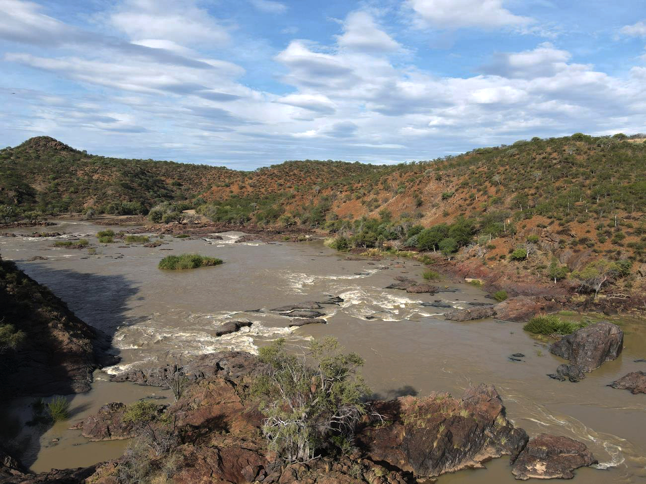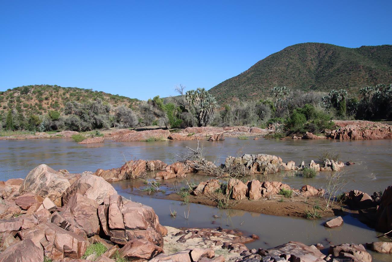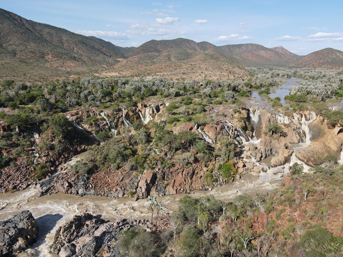 La Kunene, cette belle rivière prend sa source en Angola et forme, sur une partie de son cours, la frontière entre les deux pays pour se jeter à l’extrême ouest dans l’océan Atlantique.