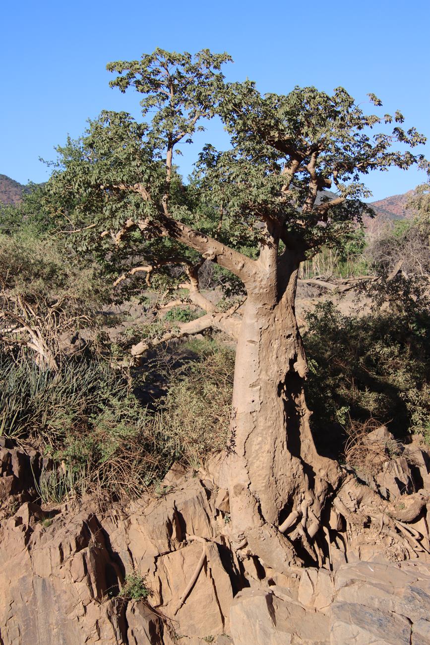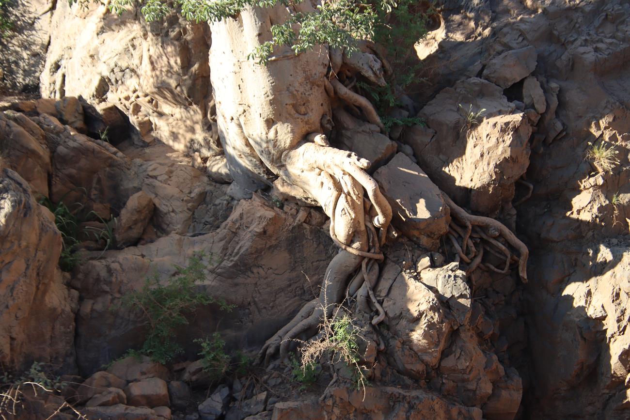Sur les rives du fleuve, des baobabs s’accrochent fermement à la roche nue avec leurs racines. Ils réussissent à grandir et s’épanouir depuis de nombreuses années malgré la rudesse des lieux.