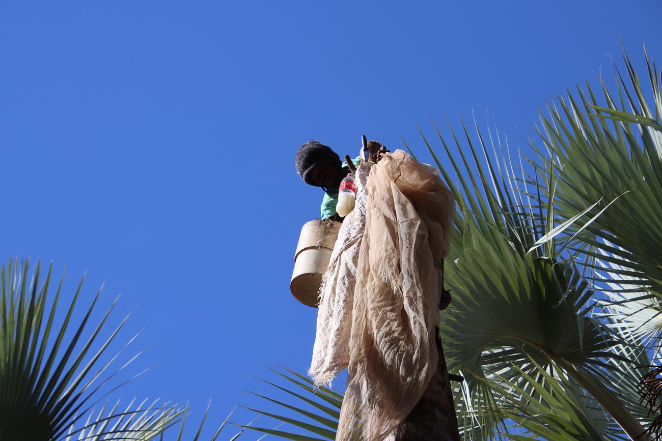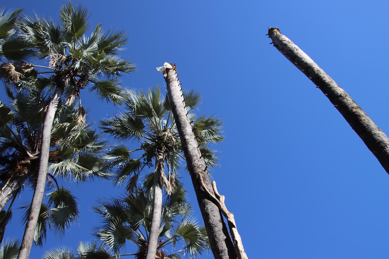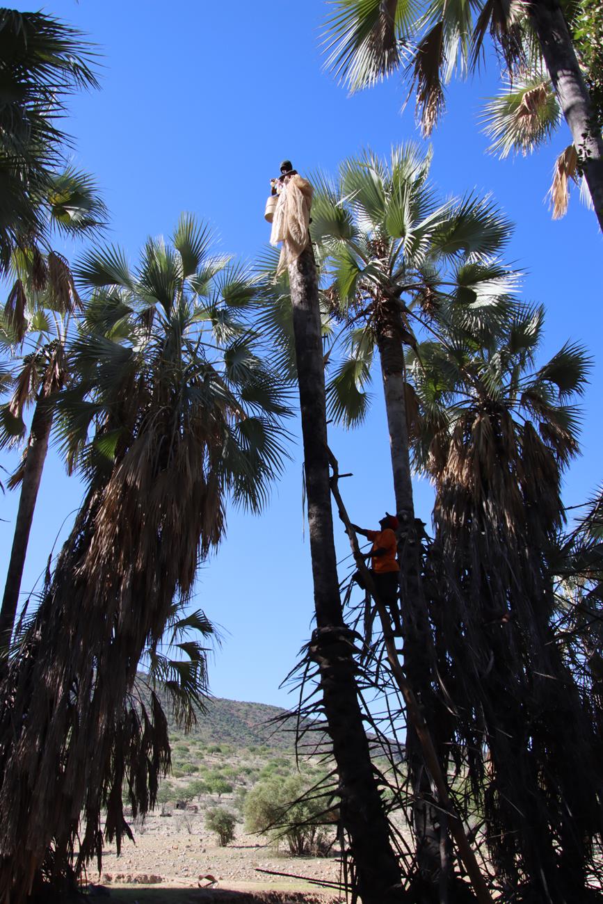J’avais remarqué plusieurs fois des palmiers étêtés. Maladie ? Orage ? Rien de tout ça. Une tribu proche des Hymbas coupe la tête des palmiers. L’eau y rentre et la sève fermente et remonte. Bon j’avoue ne pas avoir bien compris les explications de John. Toujours est-il que c’est très fort et que beaucoup d’hymbas en boivent. Nous sommes d’ailleurs retrouvés avec un petit rassemblement ou tout le monde sirotait allègrement ce breuvage. Femmes, mêmes très jeunes et bien sûr les hommes. Il était 9 h !