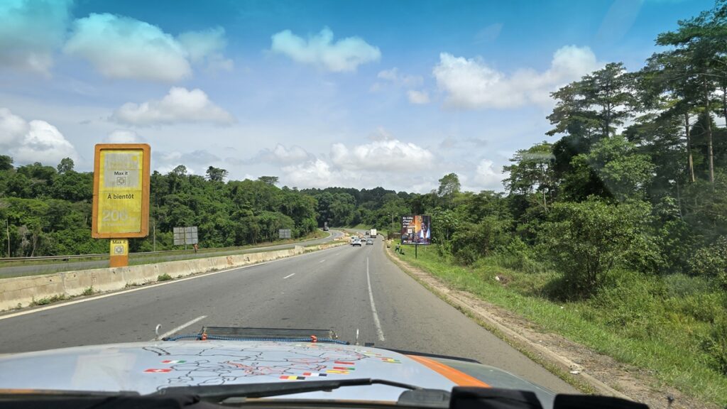 Nous avons quitté Abidjan ce matin vers 10h, en direction de Yamoussoukro, la capitale politique et administrative de la Côte d’Ivoire. La route est une quatre voies sur environ 240 kilomètres. Rien de particulier à signaler, si ce n’est que c’est une très bonne route, agréable à rouler.