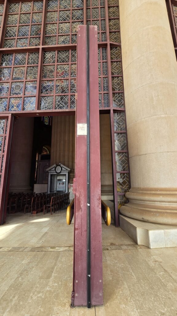 Ces vitraux ont été conçus et fabriqués en France, notamment par l’atelier Colin à Chartres, selon des techniques traditionnelles mêlant verre soufflé et sertissage au plomb. Ils représentent des scènes bibliques, des symboles religieux, ainsi que des éléments plus surprenants comme le Christ aux côtés du président Houphouët-Boigny. ( prise de photos interdites à l’intérieur)