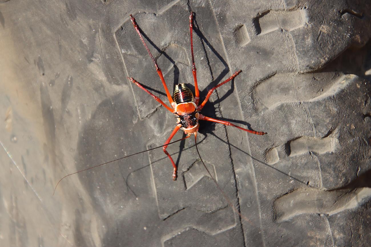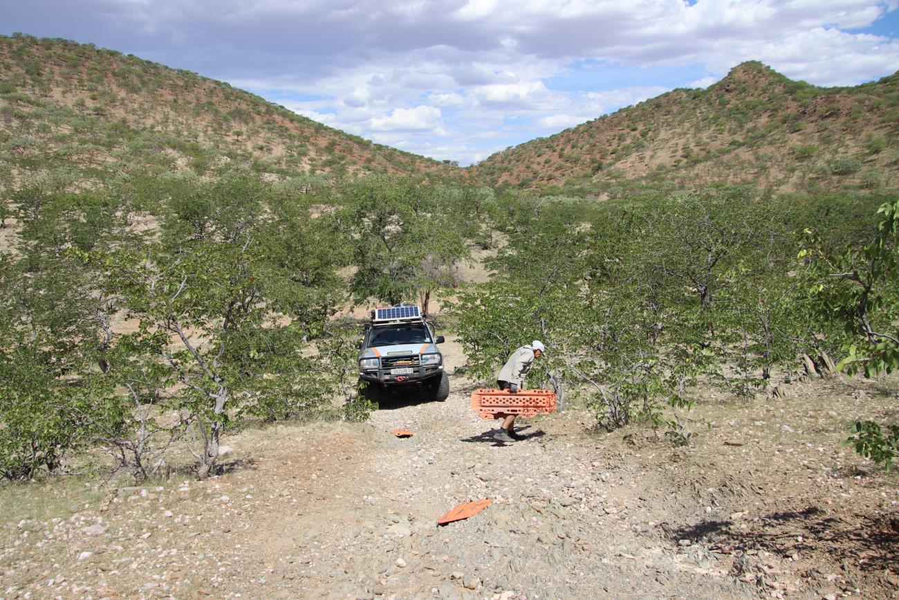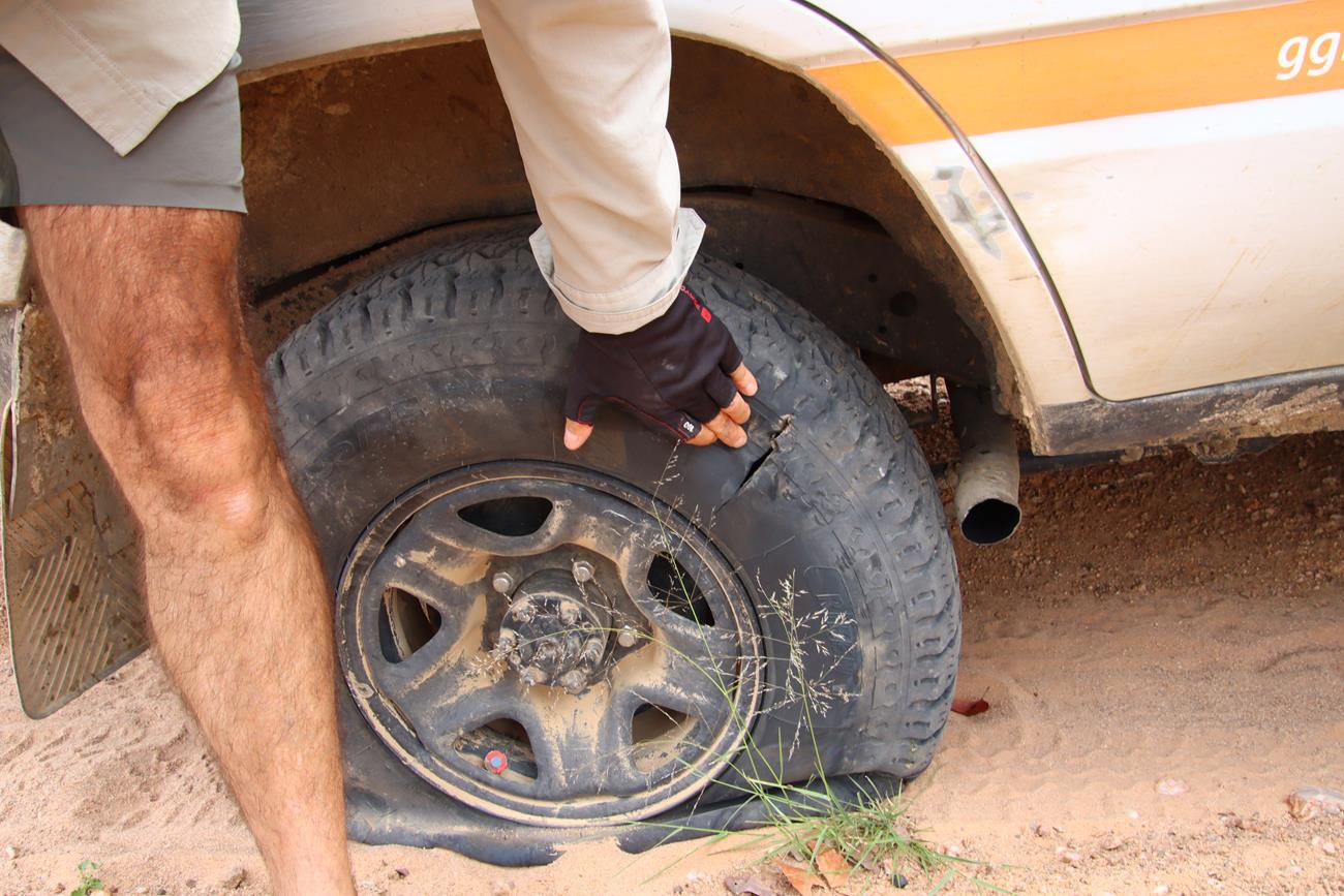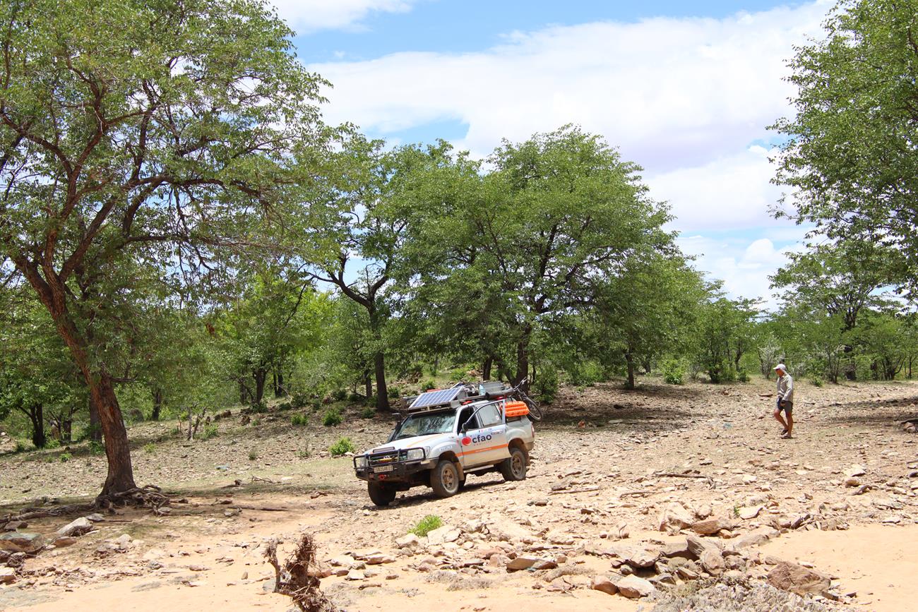 Enfin dans la vallée. Nous nous dirigeons vers le camp de Van Zyl’s et à 13h , paf , crevaison ! En fait , rien de grave d’après Yannick, c’est une ancienne crevaison . Il répare et nous repartons.