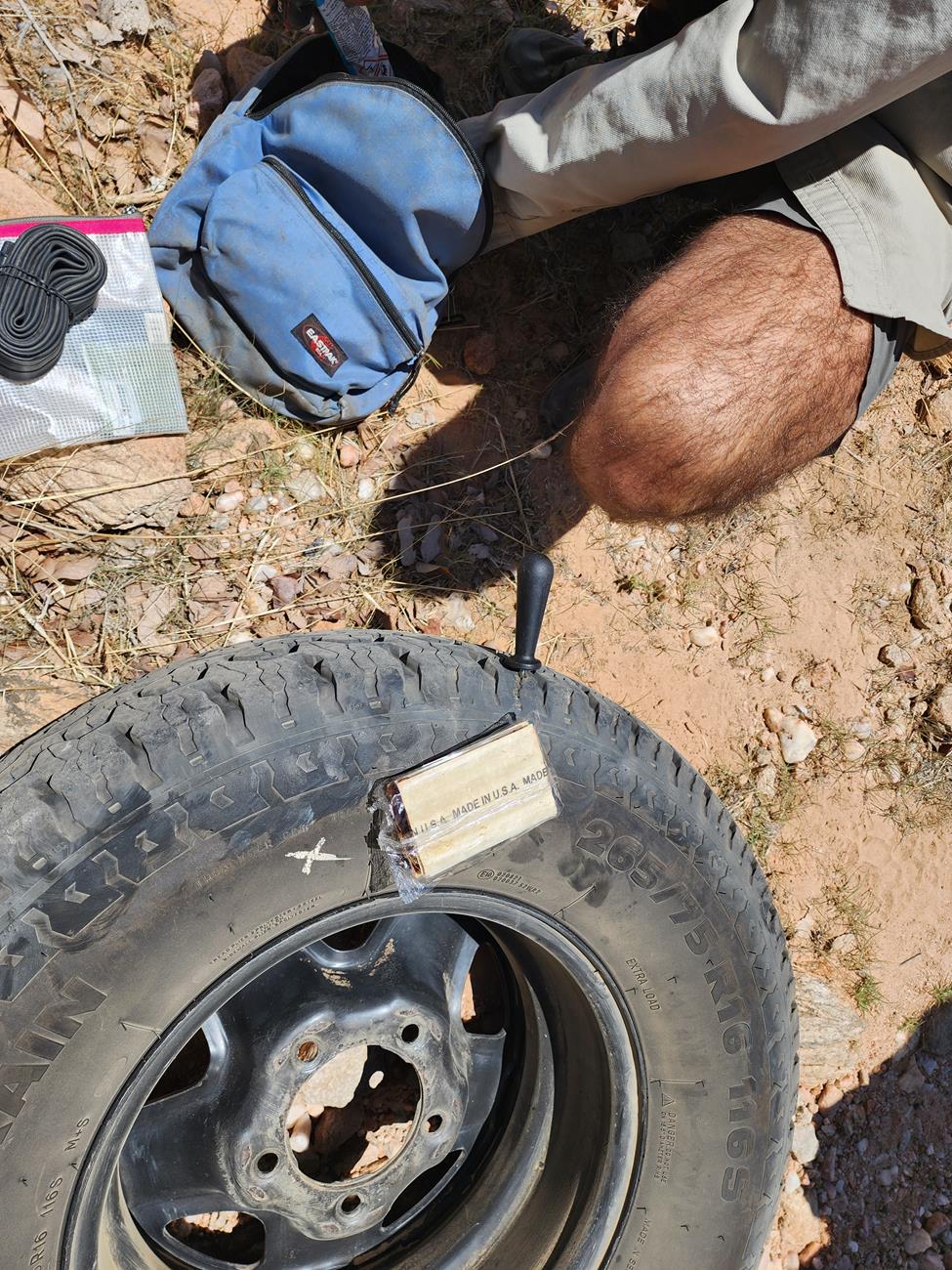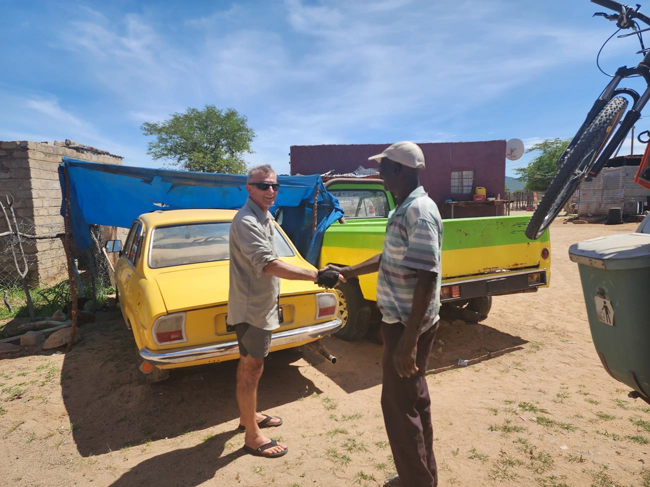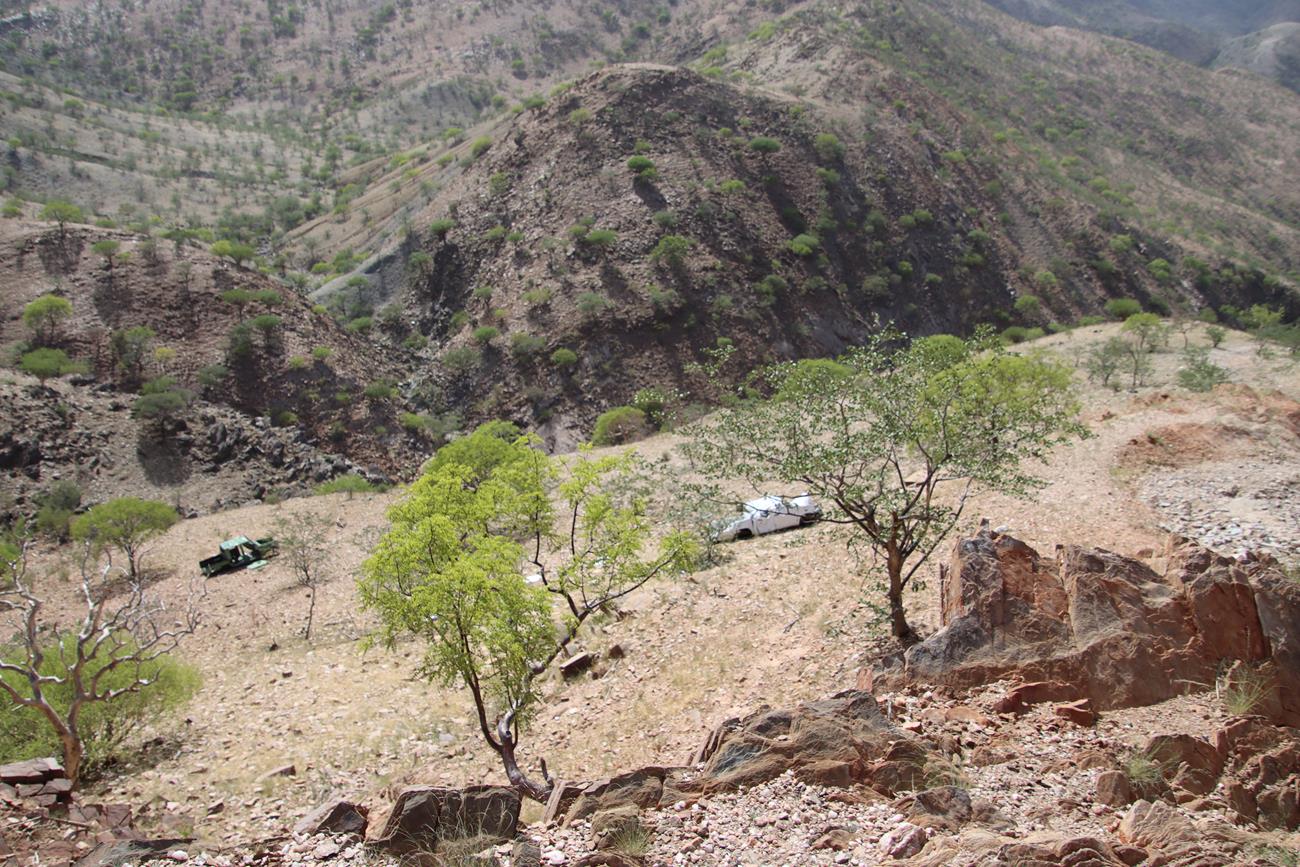 Enfin dans la vallée. Nous nous dirigeons vers le camp de Van Zyl’s et à 13h , paf , crevaison ! En fait , rien de grave d’après Yannick, c’est une ancienne crevaison . Il répare et nous repartons.