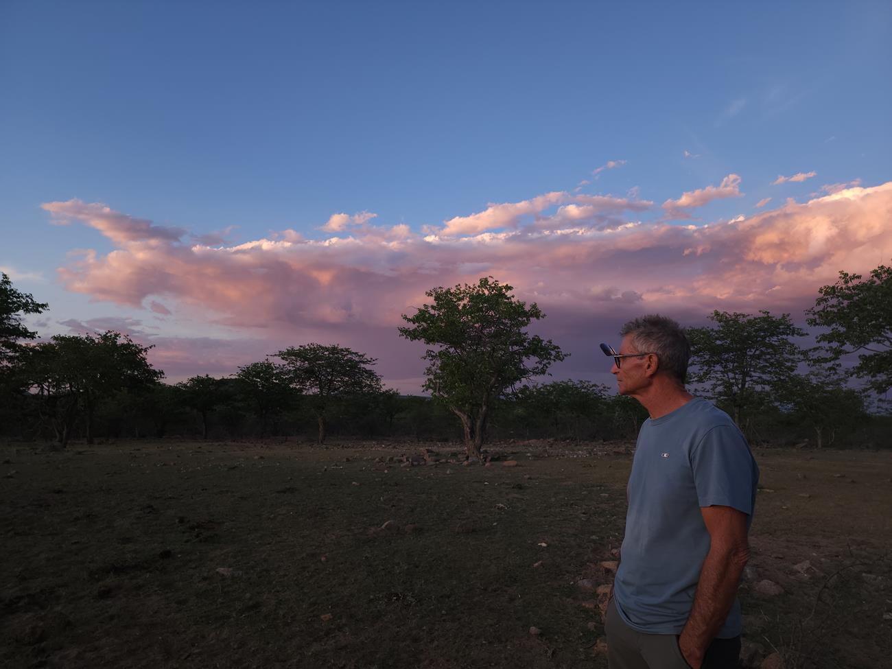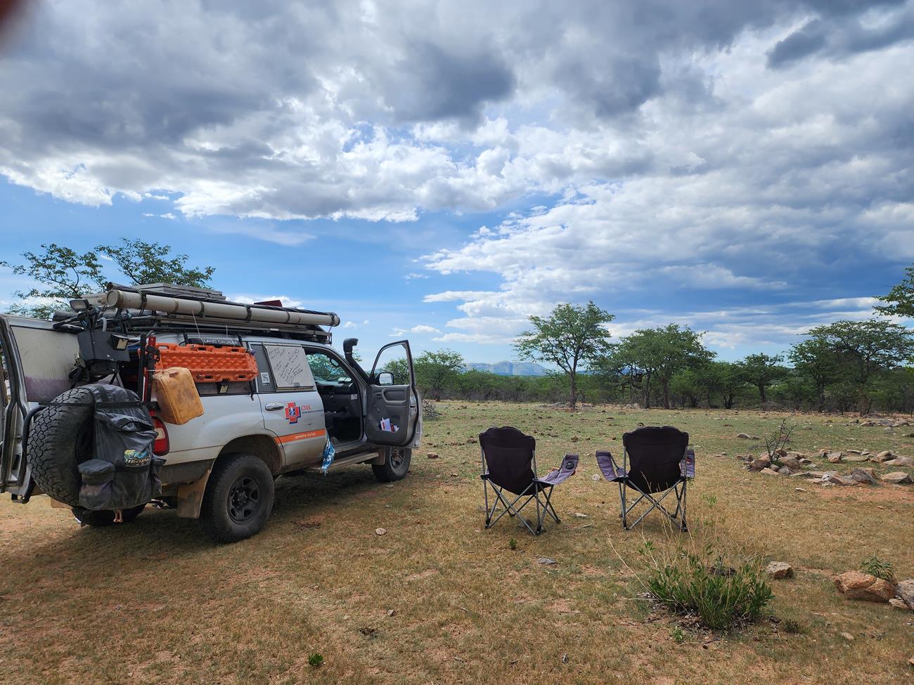 Nous campons à 500 m de la crevaison . Nous avons la visite de deux Himbas. Yannick leur demande, je ne sais pas en quelle langue, si nous pouvons dormir sur place. Tout le monde semble se comprendre et c’est ok .