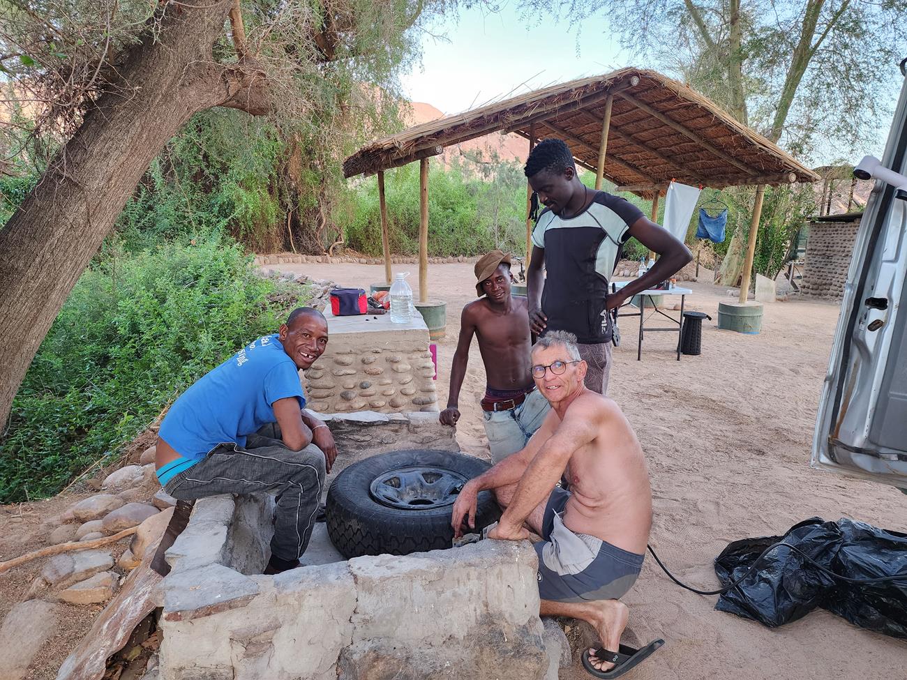 Yannick se fait aider par des Himbas pour déjanter et changer le pneu et ensuite repos et dodo.