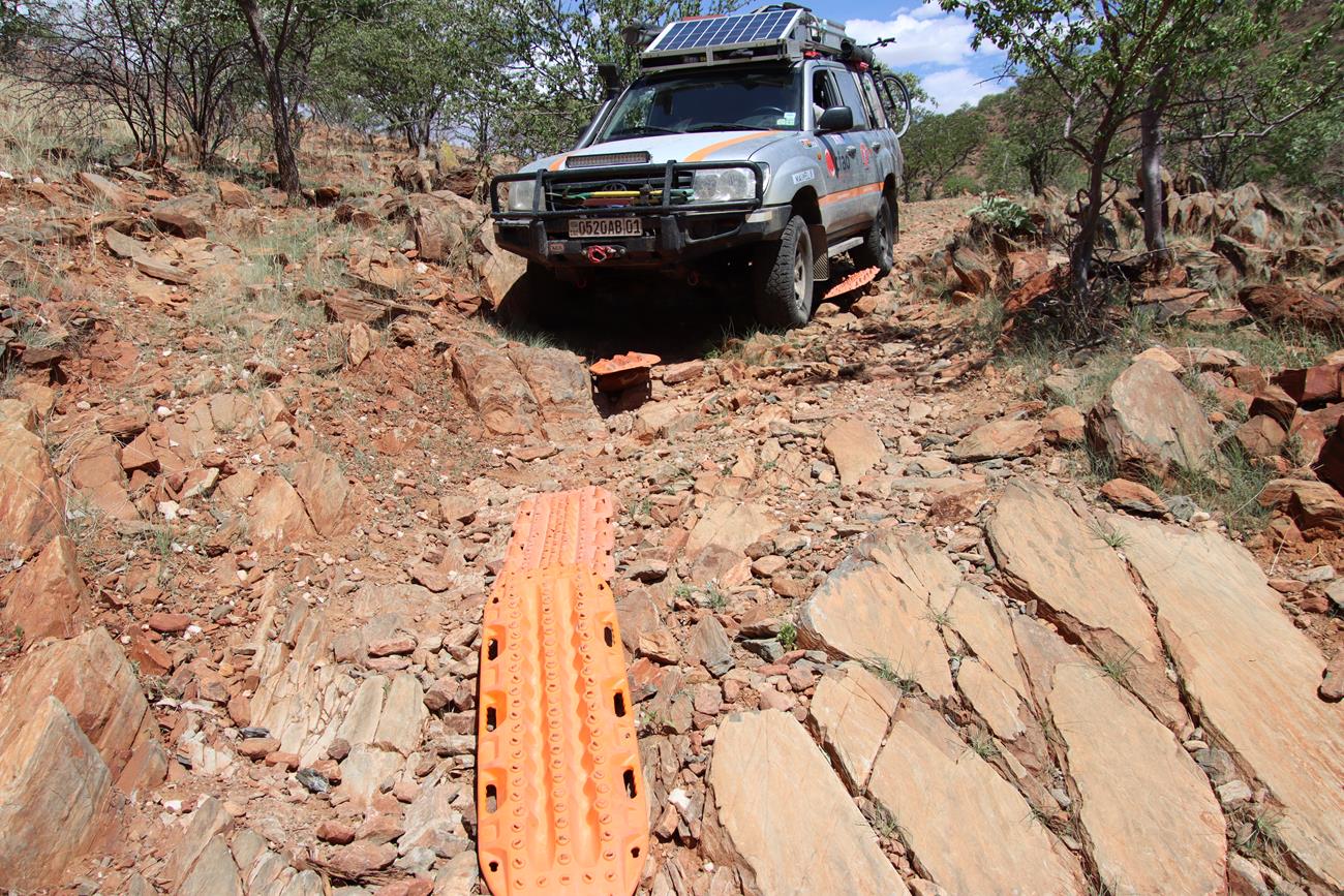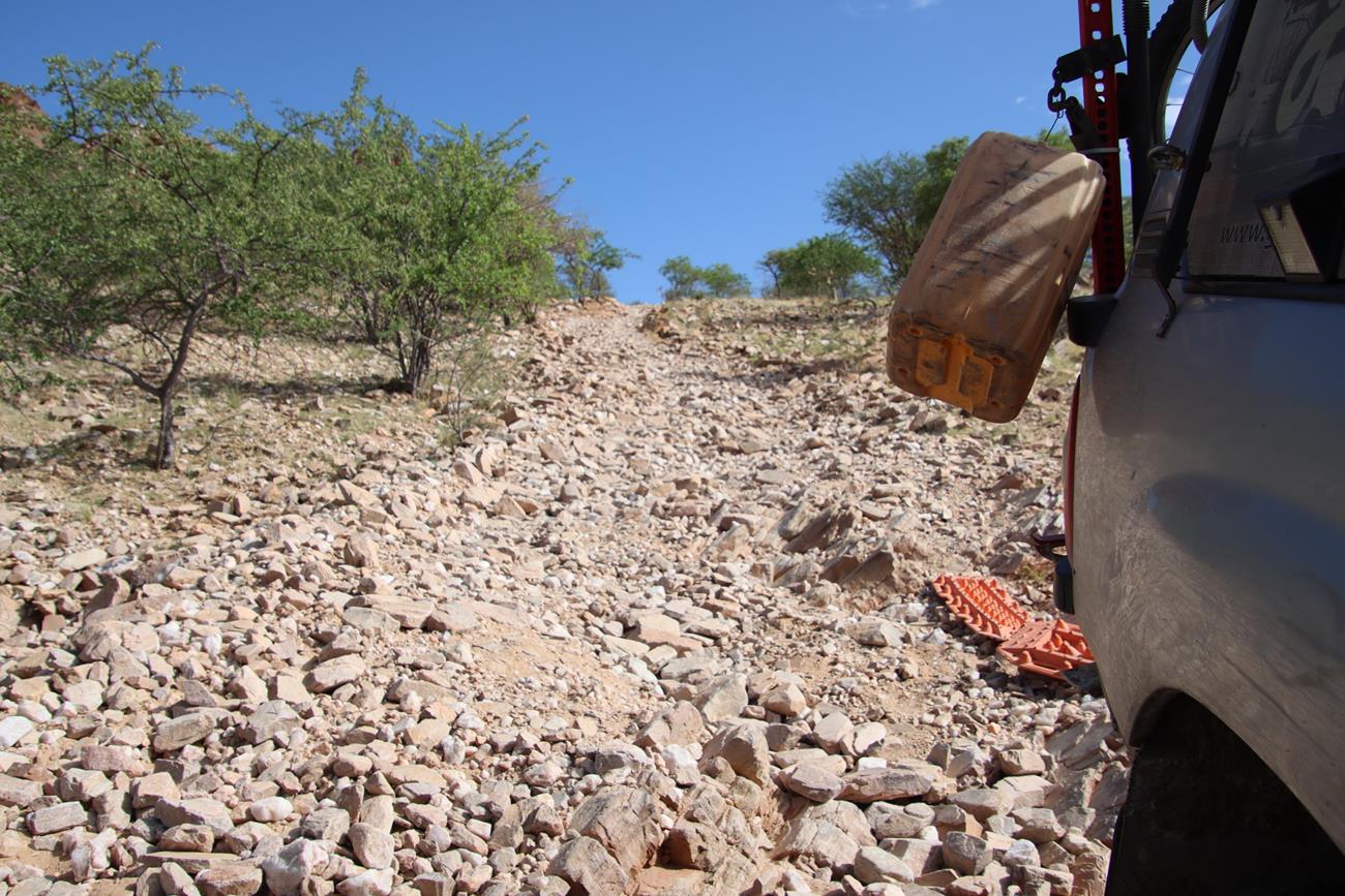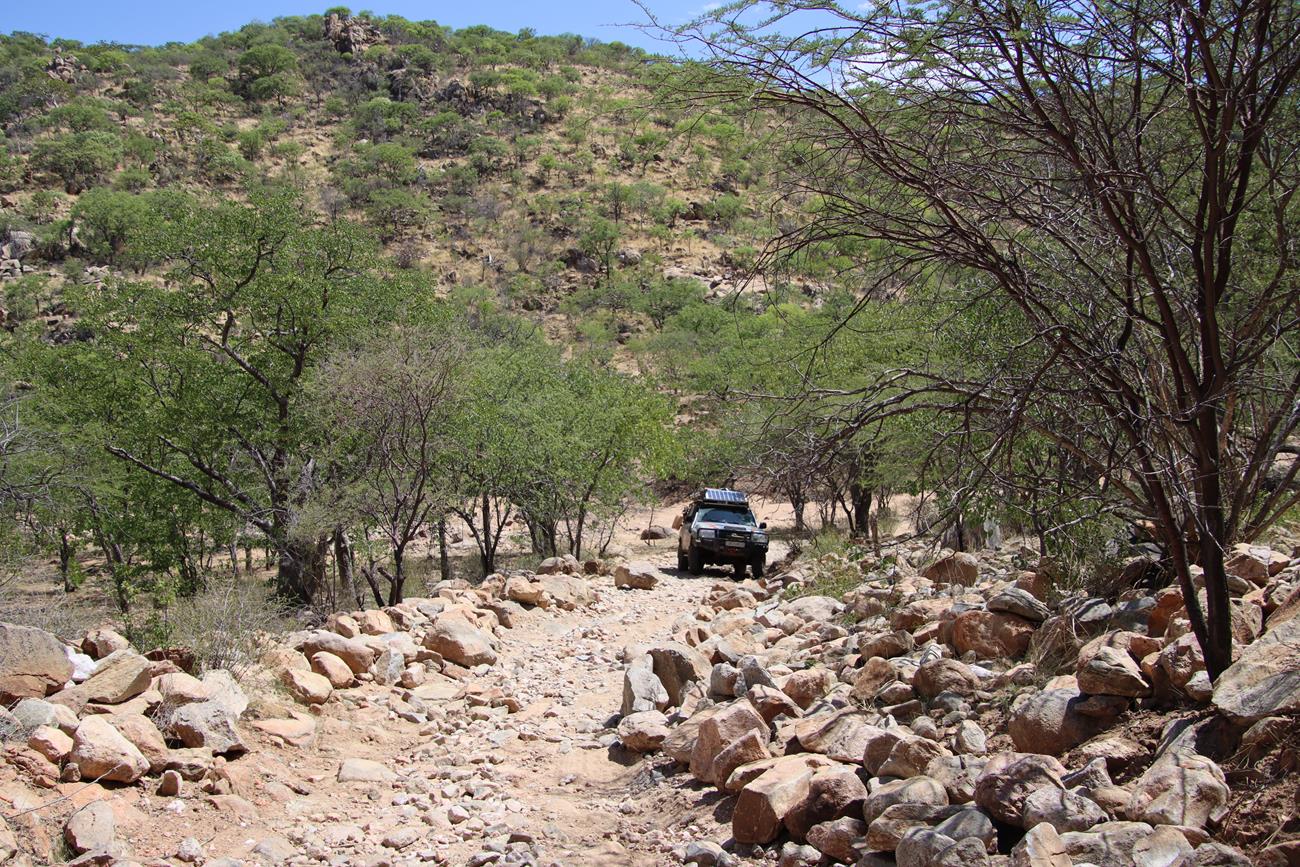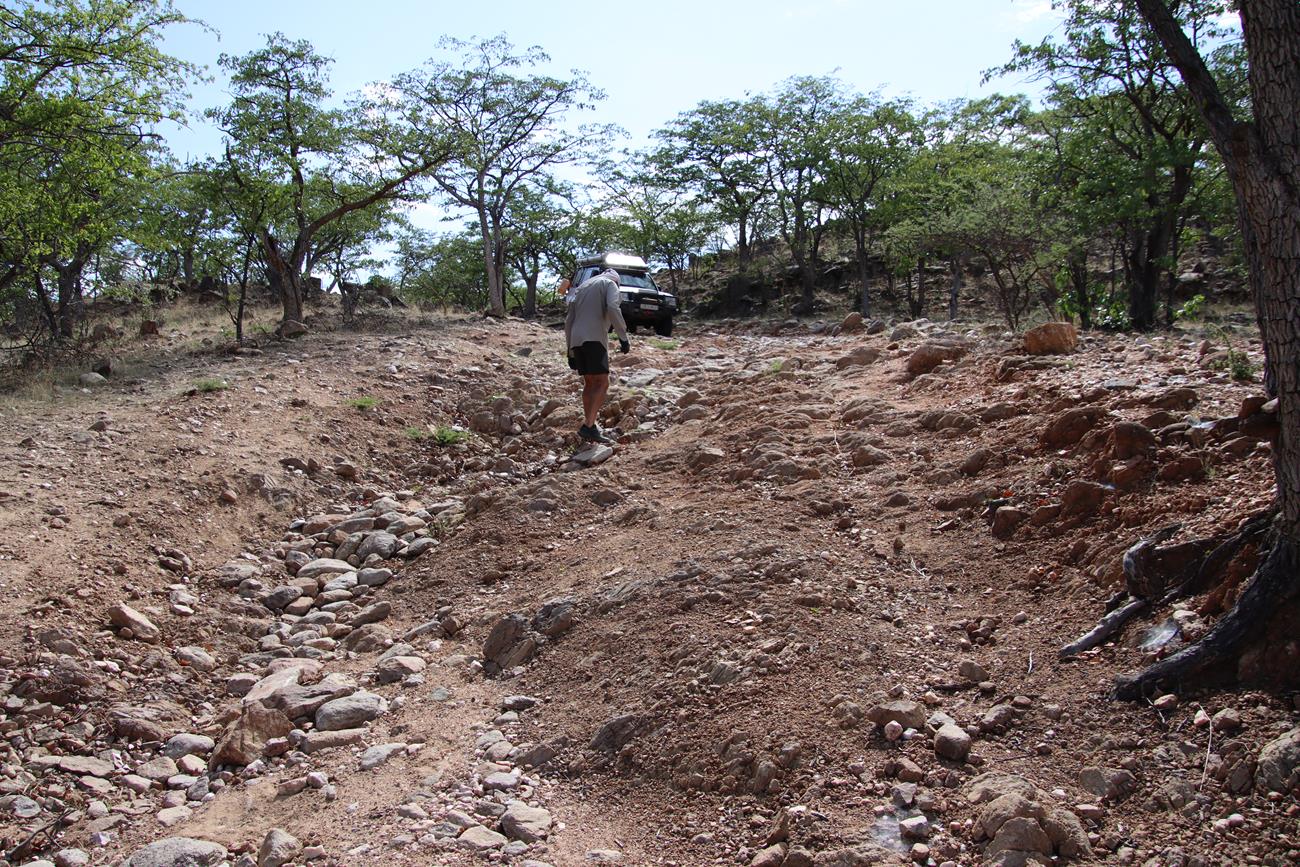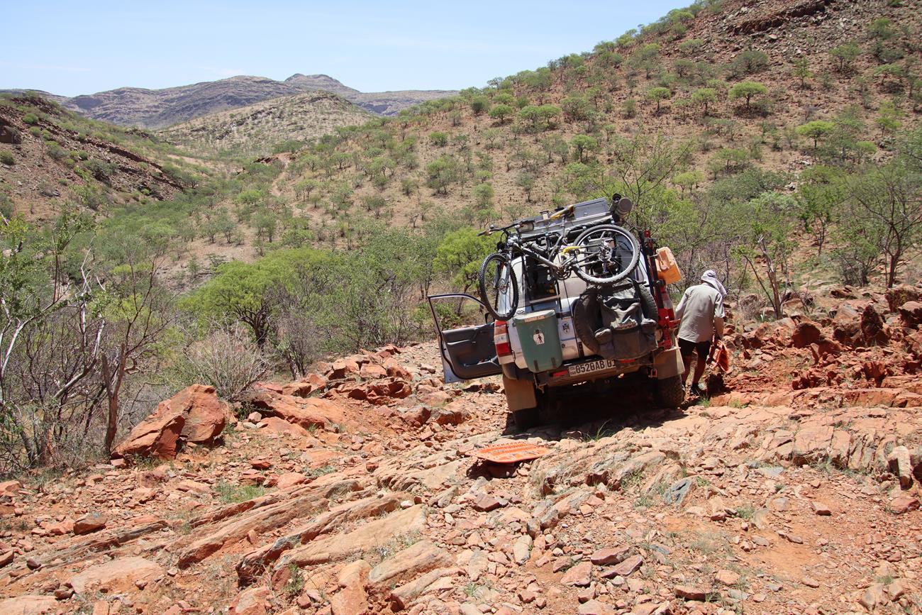 Gardez toujours en tête que l’on n’est jamais sûr de ce que l’on peut rencontrer. Il suffit d’une grosse pluie pour déstabiliser la piste ou un passage de bétail des Himbas. Les bêtes remuent la piste, ce qui peut entraîner une perte d’adhérence des véhicules sur certaines des plus petites montées et des glissades importantes dans les descentes.