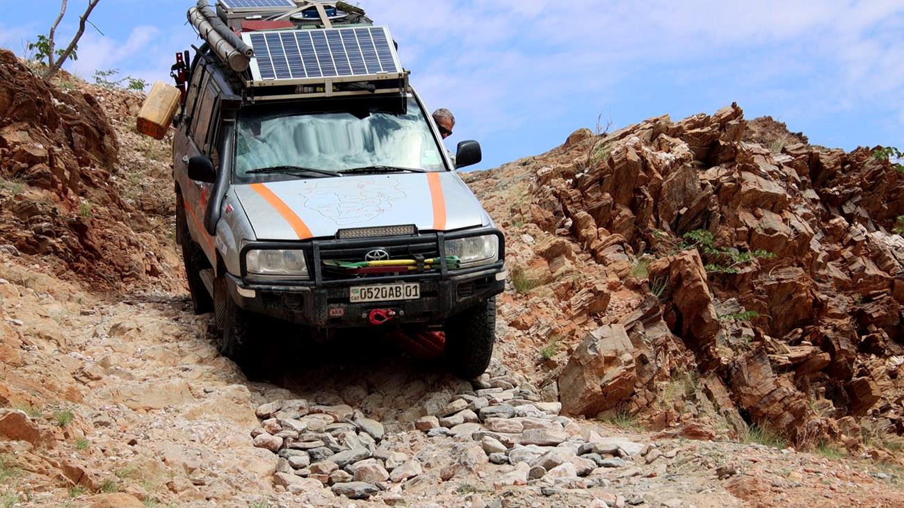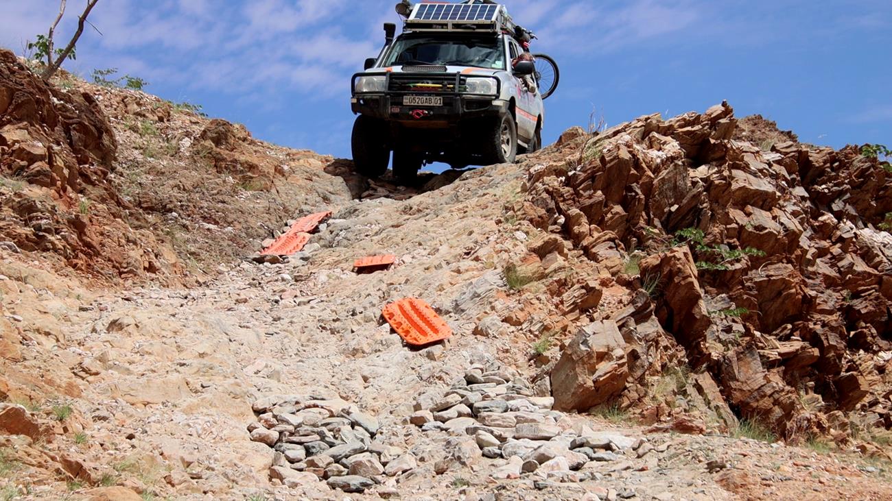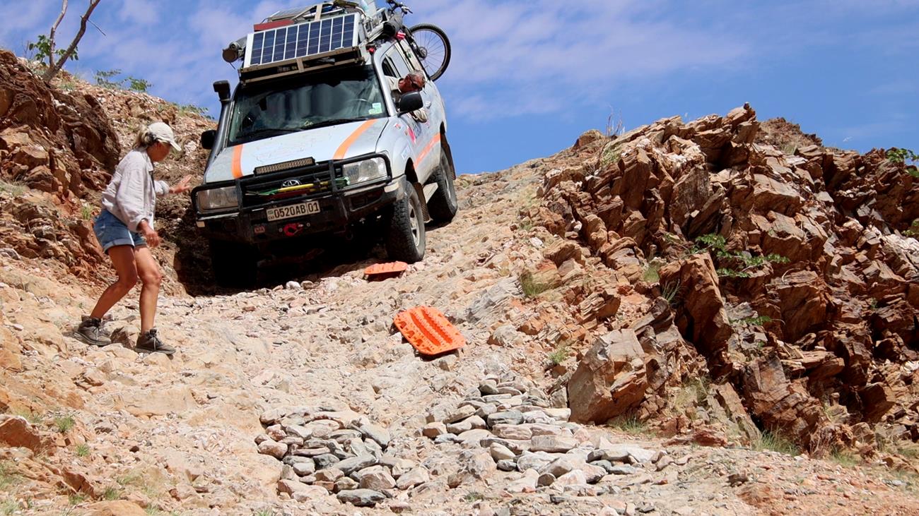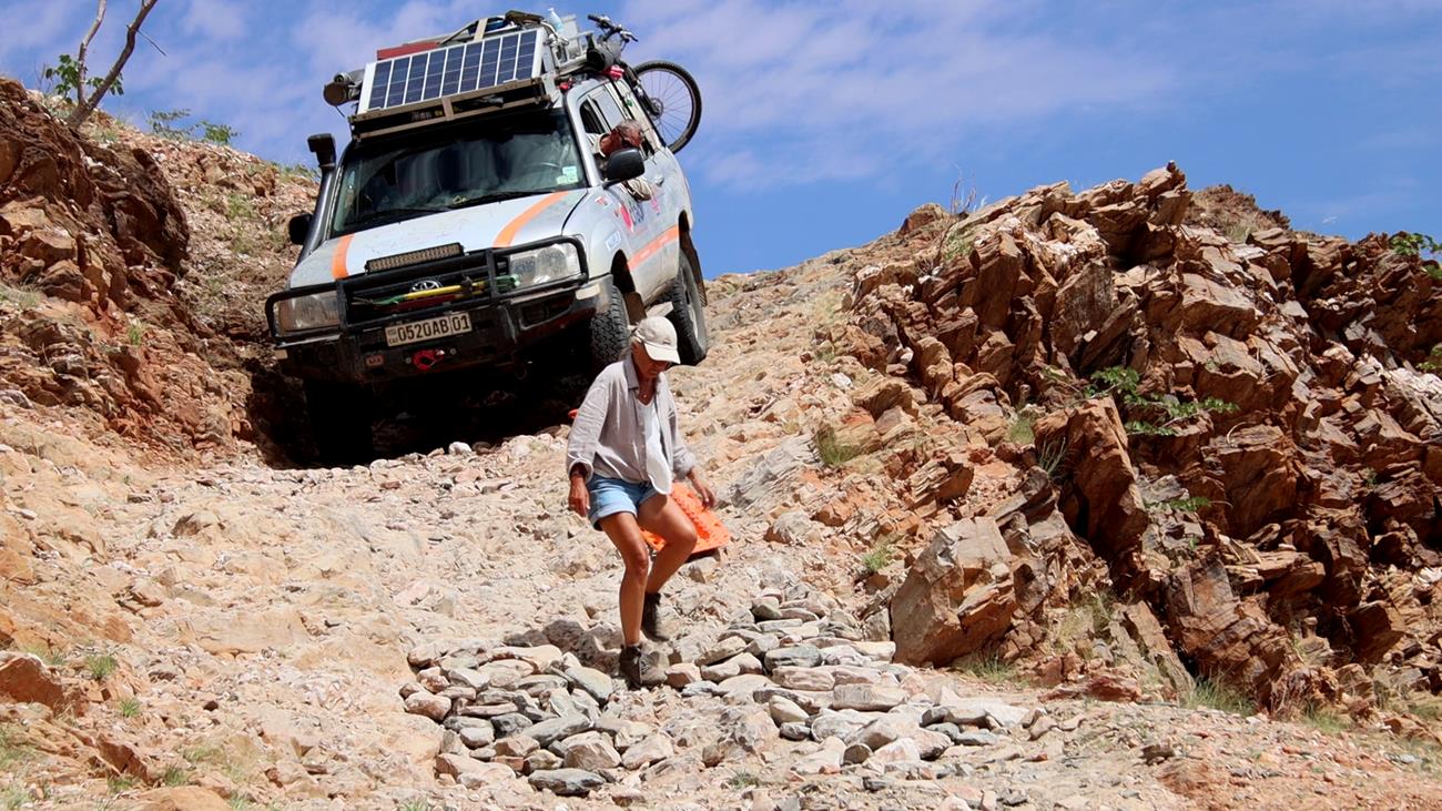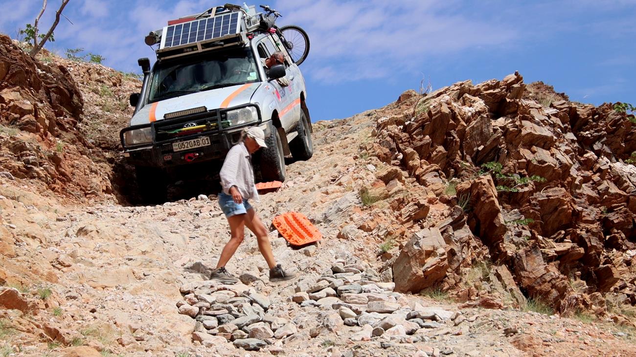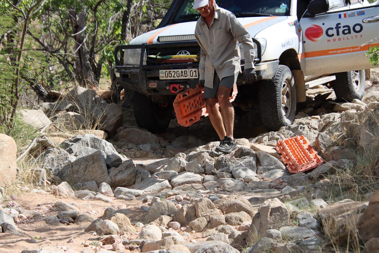 Nous passons 1 h 30 à empierrer le passage enfin de diminuer la hauteur des marches. Cela fait deux jours que nous passons notre temps à monter , descendre de la voiture, porter des cailloux, en déplacer , en jeter , poser les plaques , les replacer , les remettre dans la voiture et ça tous les 300 m parfois sur 2 kms ! A tel point que le plus souvent je marche devant la voiture sans y remonter ! salle de fitness imbattable !
