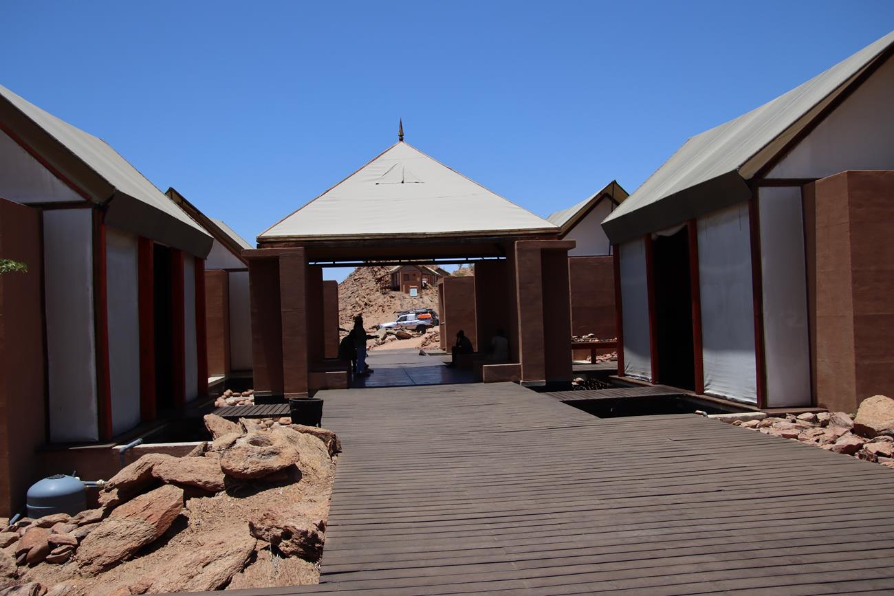 Avant de quitter le camp, nous allons voir au shop pour acheter de l’eau. J’allais oublier de vous dire, lors de la descente de Van Zyls nous avons bu 9 litres d’eau par jour tous les deux. Après le passage au magasin fermé ! Nous sommes obligés de taper dans nos réserves. Première fois que cela nous arrive.
