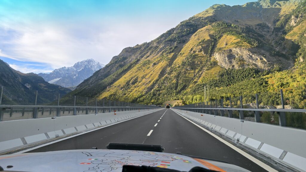 Nous voilà embarqués sous le tunnel. Oui, le Grand-Saint-Bernard est juste là… au-dessus, à droite… pendant que nous sommes gentiment en dessous, pour toute la traversée. Grrr.