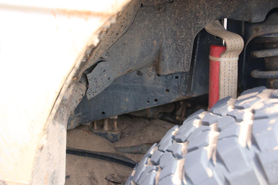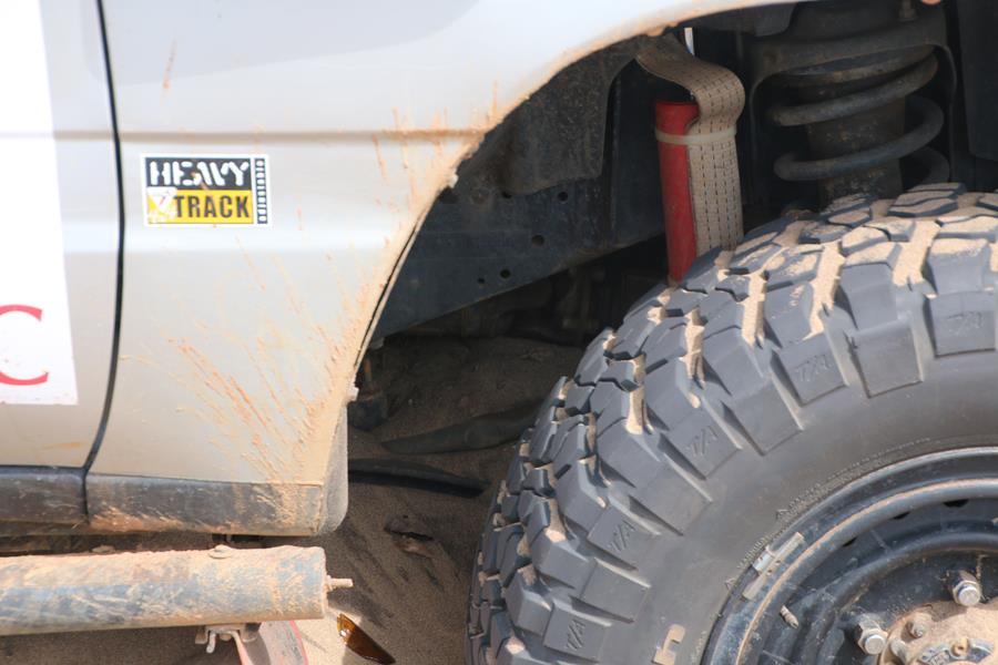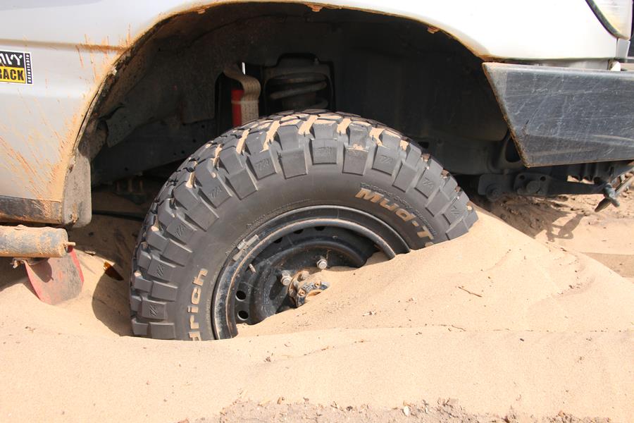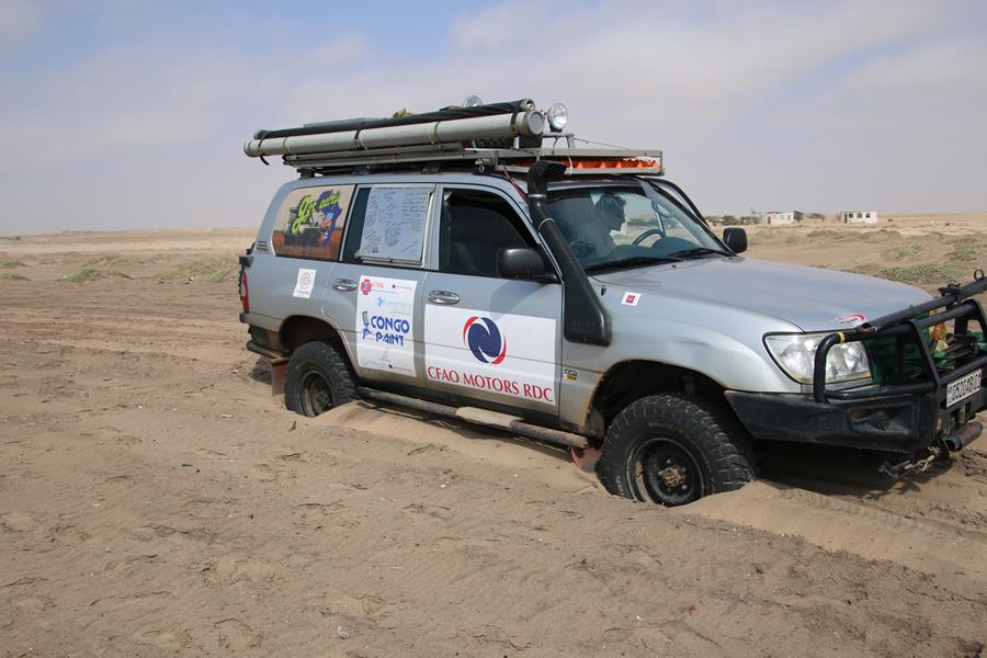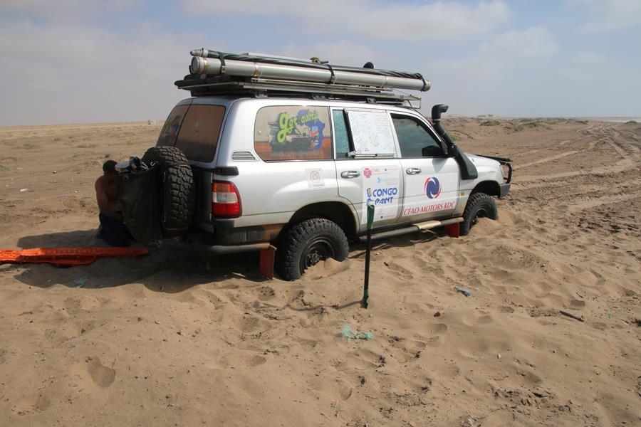 Plaques de dessablage installées, blocage avant arrière enclenchés (merci Patrick), Yann met les gaz, et il recule, la voiture accroche les plaques et retombe dans le sable mais grâce aux blocages, elle sort