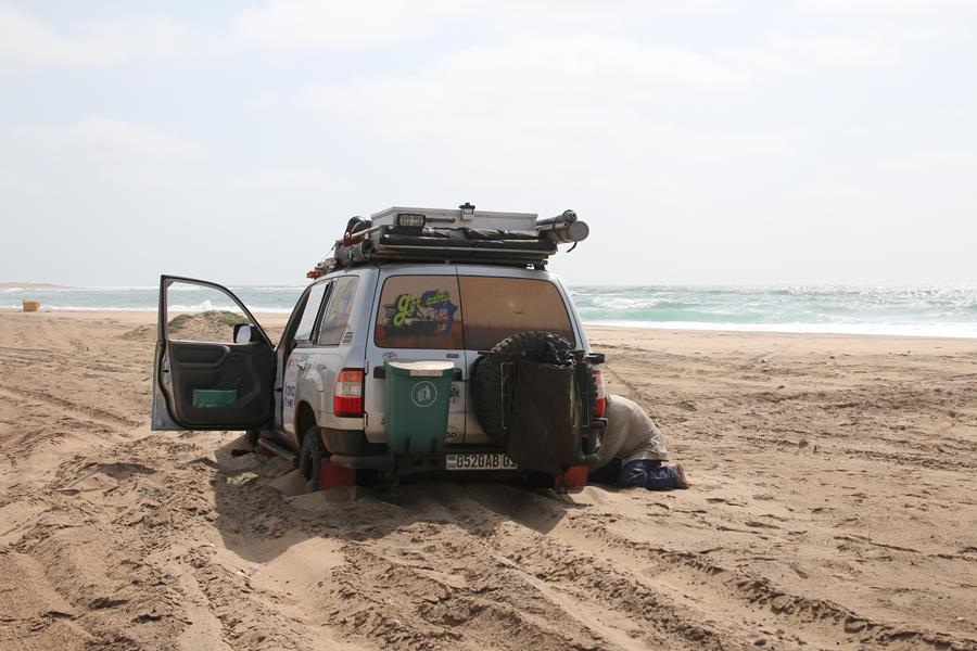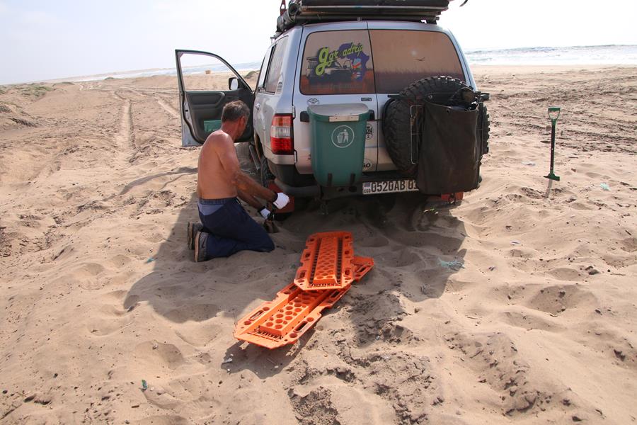 Lorsque Yann prend les pelles, nos sympathiques Angolais s’en vont. Cool, allez Gégé au boulot avec Yann. Une voiture arrive à coté de nous, le chauffeur nous prend en photos entrain de pelleter et il attend. Je commence à sentir les ampoules dans les mains, ça pique. Je regarde derrière moi et je vois la mer et surtout, j’ai l’impression qu’elle monte ! Je suis de nature optimiste mais là, je me suis fait un film, je pense à sandwich Harbour en Namibie ou des voitures ont été englouties dans pareil cas. Impact positif : j’ai pelleté plus vite ! Je me suis gardée de raconter à Yann avant la sortie de la voiture.