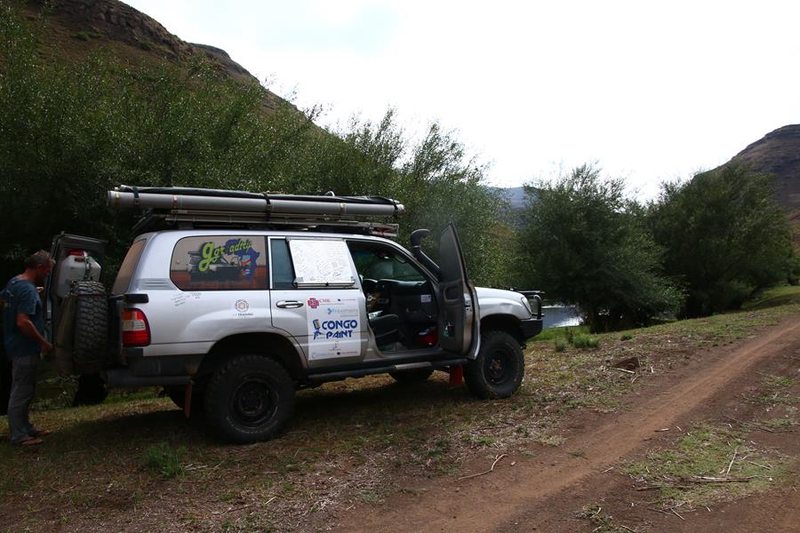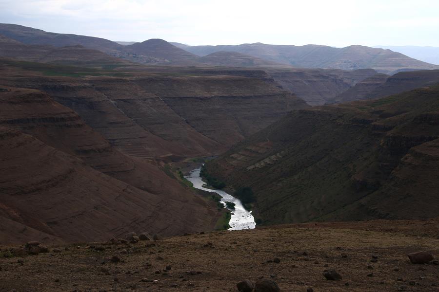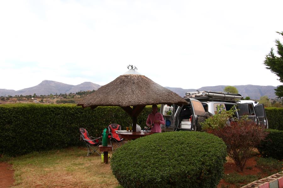 Départ par l’A3 vers Thaba-Tseka au centre du pays et Ha Mensel pour le camp. La route est très belle. Les infrastructures routières sont impressionnantes (là c’est diffèrent du Congo !)Nous montons et descendons sans cesse, pas de lacet pour réduire les montées ou les descentes. C’est du 12, 16, 18 et 20% à chaque col. Nous arrivons au camping face au barrage, il fait froid et le vent est terrible. Le camp est moche, nous croisons un jeune couple allemand pas vraiment emballé par le site non plus. Nous décidons de chercher un autre endroit, nos jeunes allemands nous souhaitent bonne chance. Quelques minutes plus tard nous trouvons une rivière. Il y a quelques voitures de touristes déjà installées. C’est tout bon, nous trouvons notre petit nid, douche très rapide, vêtements chauds, diner et au lit de bonne heure.