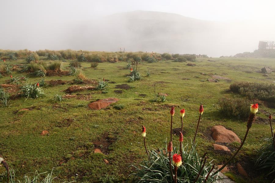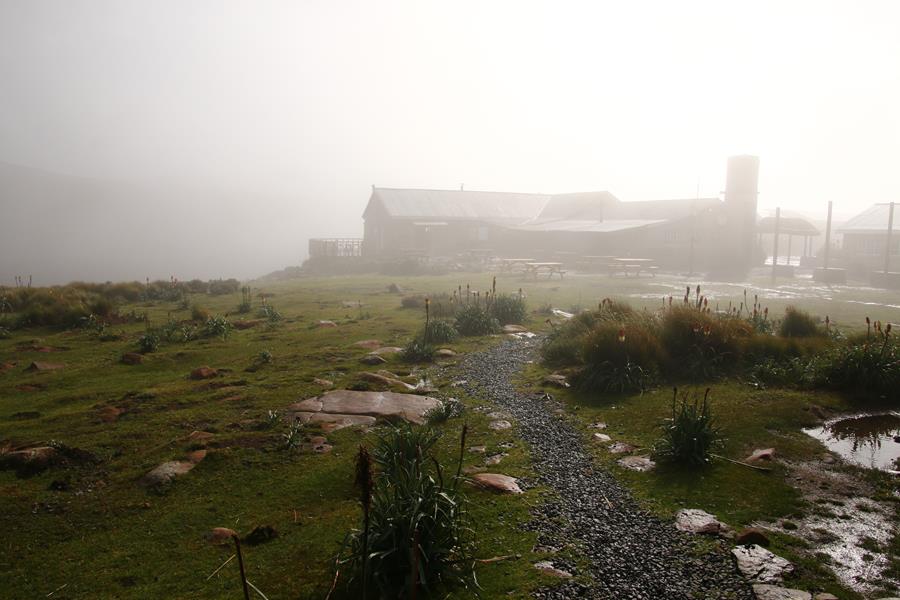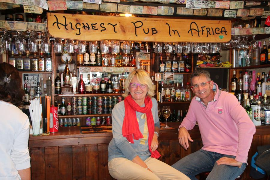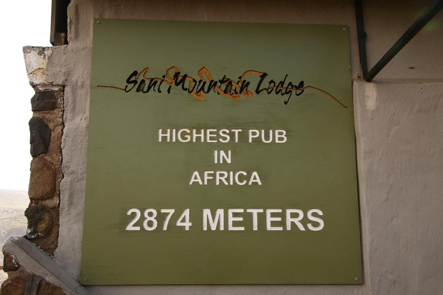 Nous arrivons donc à Sani pass dans le brouillard. Impossible de descendre dans ces conditions, pas à cause du pilote ou de la voiture mais passer ce col sans prendre de photos, pas question ! De toute façon nous sommes un peu fatigués alors on se pose dans le lodge. Il y a un poêle dans la chambre, température extérieur 8°, brrrrrrrr. Diner sympa et photo obligatoire sous la pancarte du plus haut pub d’Afrique.