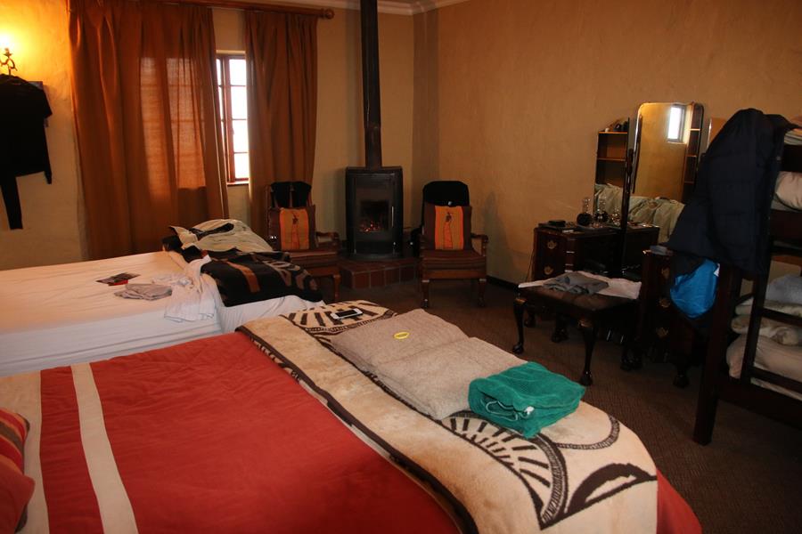 Nous continuons notre route par la A 25(en direction de Khanyane, ensuite A1 jusqu’à Moteng top ou nous trouvons un gest house. Impossible de camper, il fait trop froid. L’endroit est au pied de la montagne et est très fréquenté en juin, juillet et aout pour le ski. Aujourd’hui nous sommes les seuls touristes. Accueil très gentils, prix très correcte (80$usd pour nous deux, pour la chambre, le diner et le petit déjeuné). Nous terminerons la soirée à 3h du matin avec le personnel du guest. Inoubliables souvenirs.