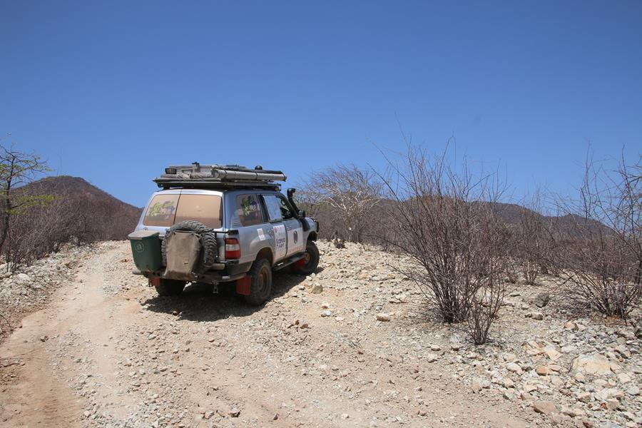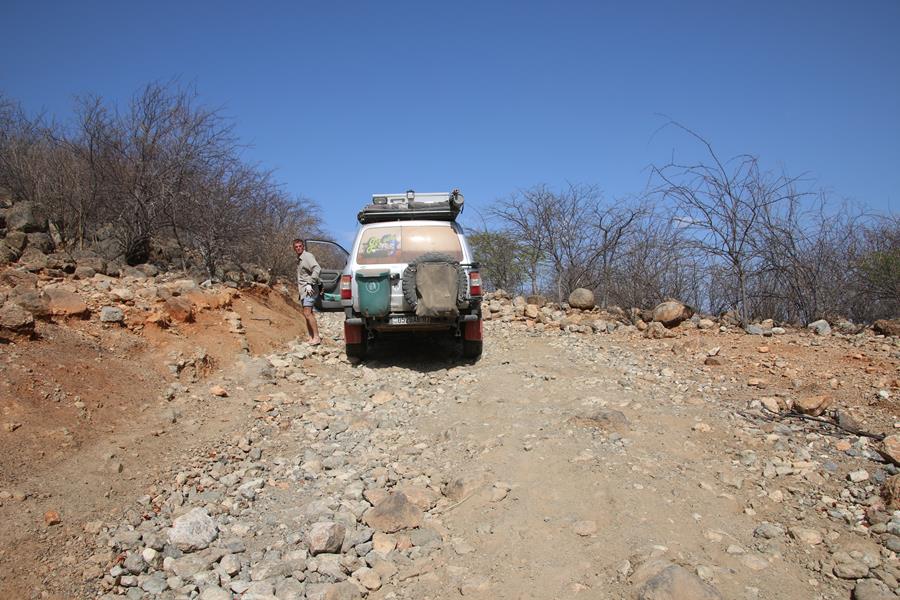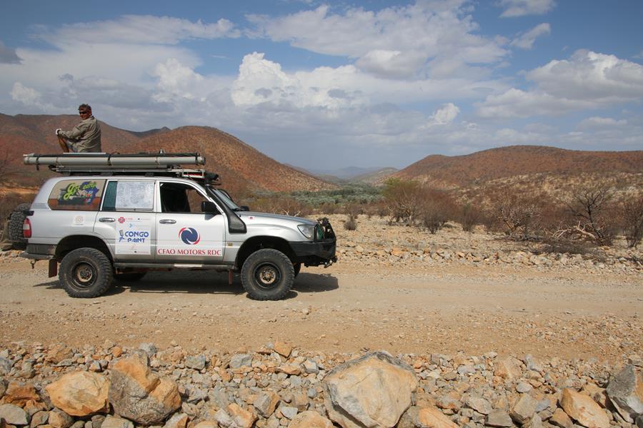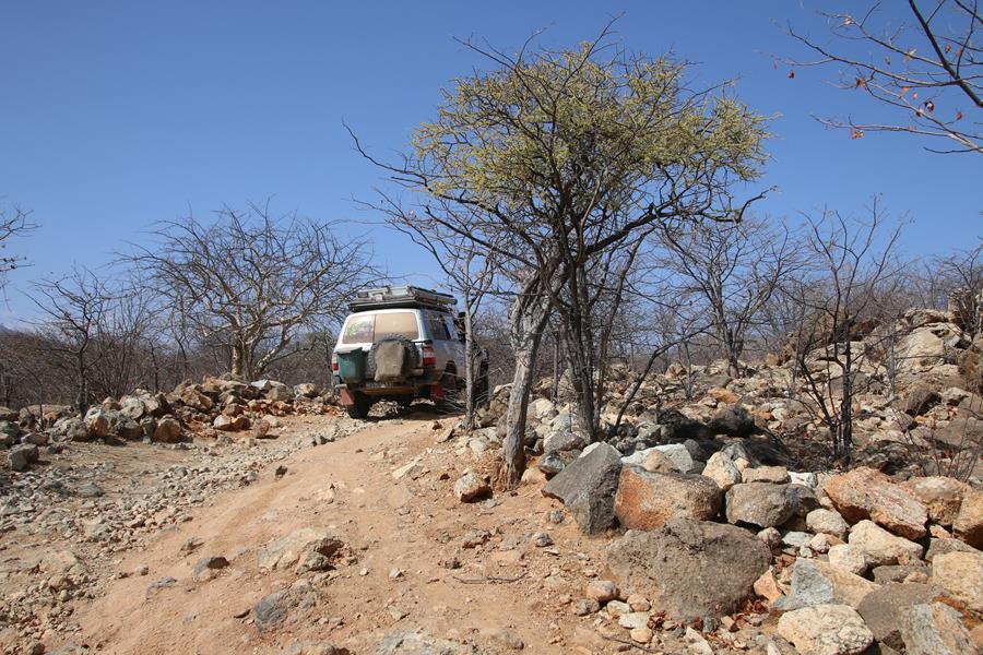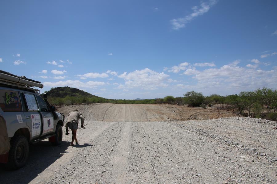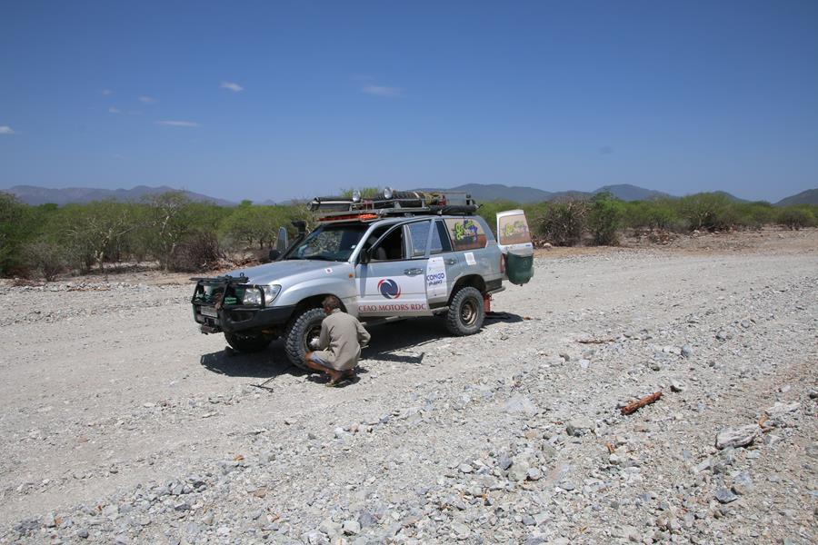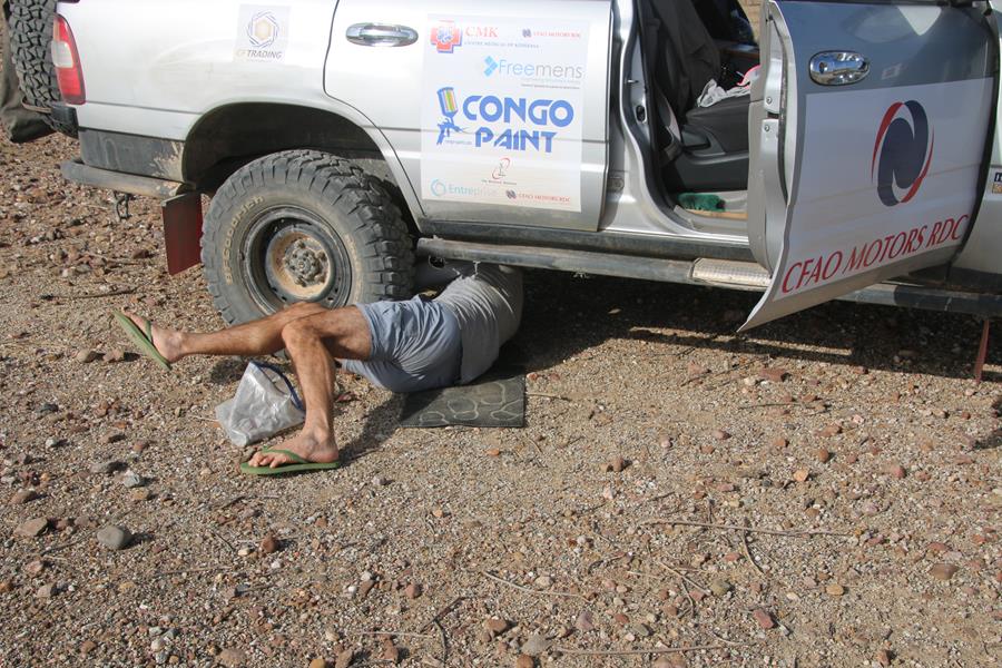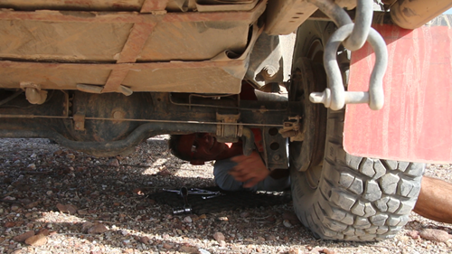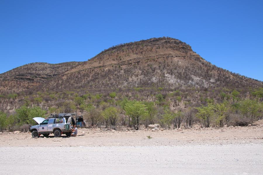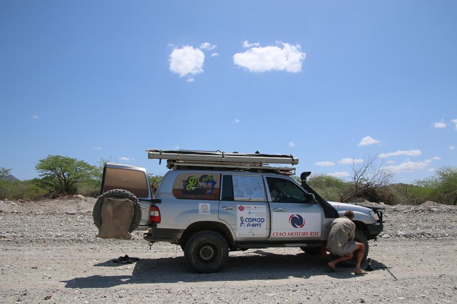 22 novemvre: En Route pour Epupa Falls. 2 minutes de piste et Yann entend un bruit anormal. STOP.la fixation de l’amortisseur bas arrière droit se dévisse, idem pour le gauche. Pas vraiment surprenant avec la belle piste, entre Opuwo et Cunene, ou le pilote s’est régalé avec les baignoires à une vitesse pas toujours réglementaire.