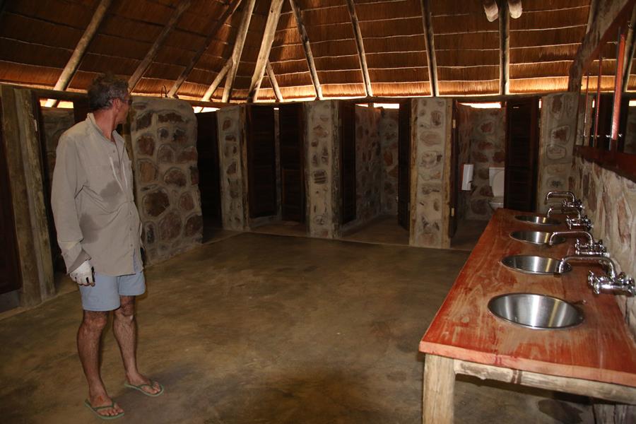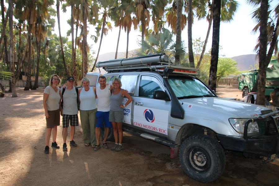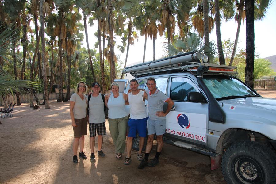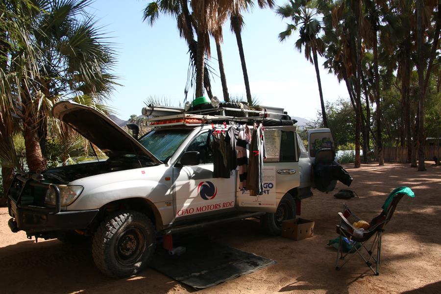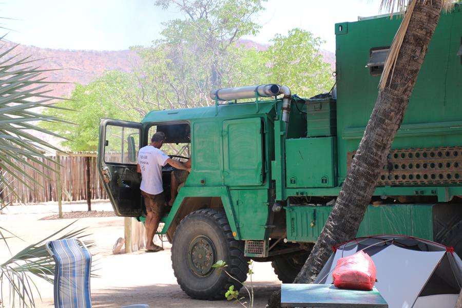 Arrivée à Epupa Falls, nous allons au camp Omarunga tenu par un couple d’allemand. Très chouette. Nous y restons 2 jours. Nous rencontrons des gens sympas, deux couples d’allemands avec qui nous buvons un verre. Ils nous écrivent un petit mot sur la voiture et deux jeunes allemands qui voyagent dans un gros M.A.N.