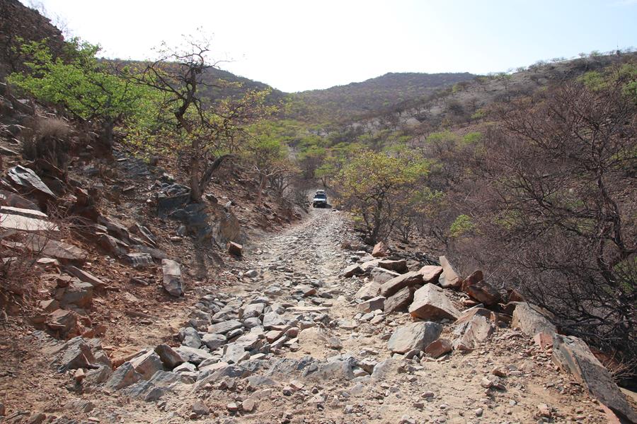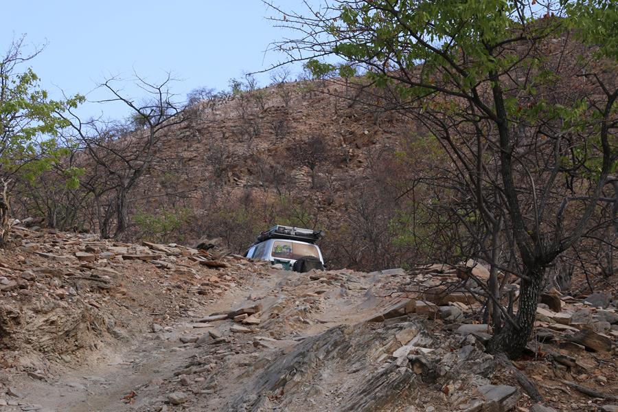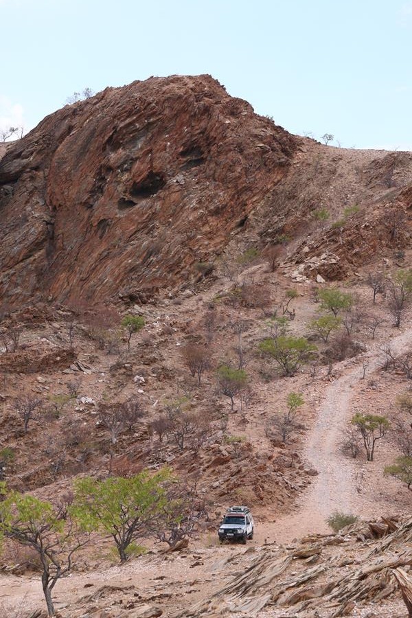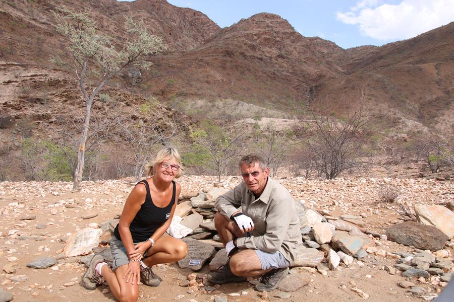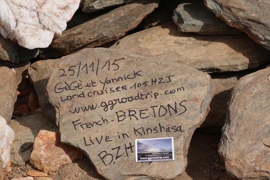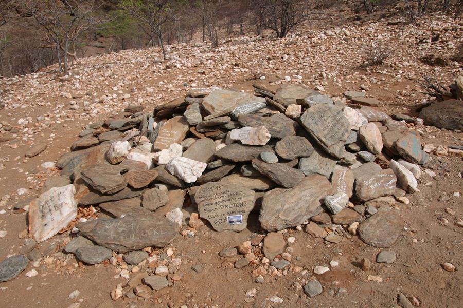 Nous écrivons nos noms sur une pierre en bas deVan zyl’s et nous partons pour les vallées de Otjinjange et Hartmann , plus connue sour le nom de Marienfluss