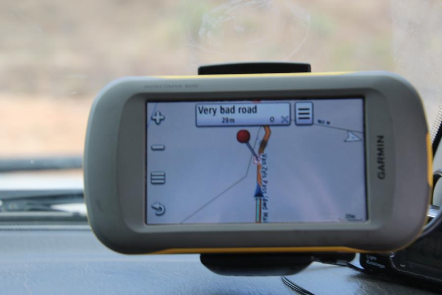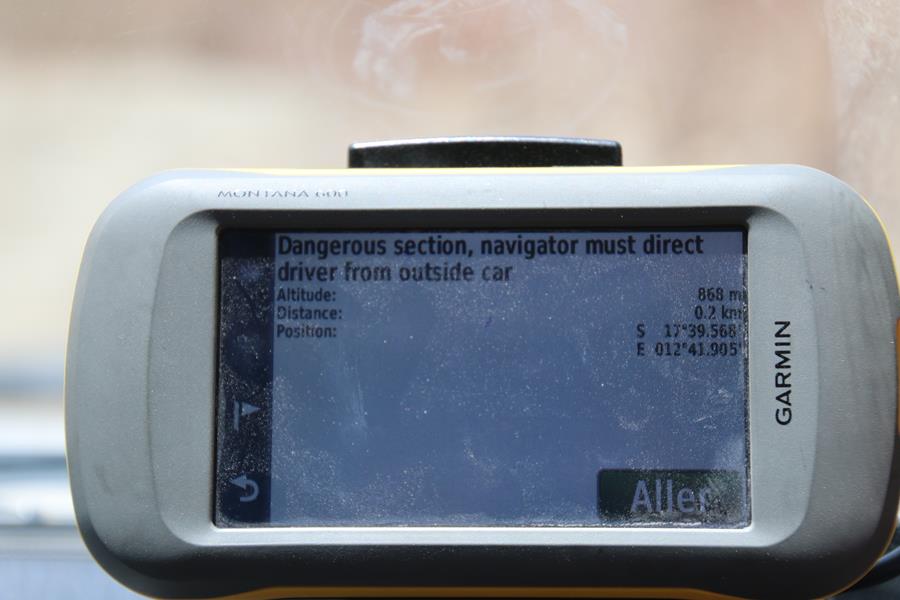 Je remonte dans la voiture et regarde le GPS. MY GOD, c’est bien par là qu’il faut passer. Sur le GPS il est inscrit : » Dangerous section, navigator must direct drive from outside car » Je dis à Yann : « avance un peu et arrête toi ICI et regarde »