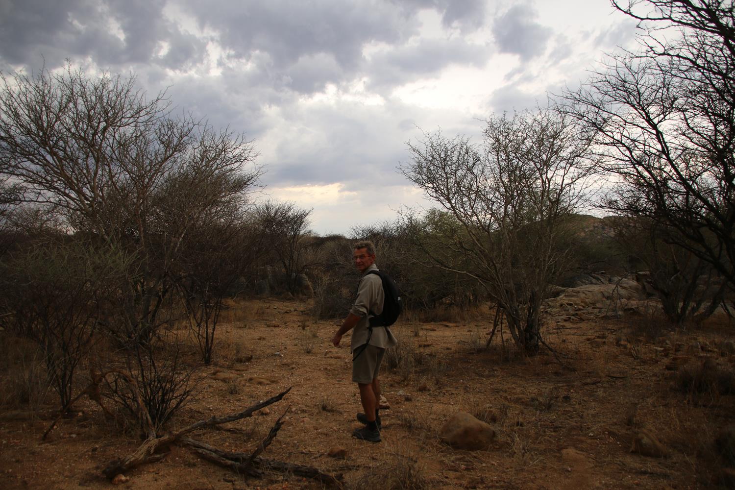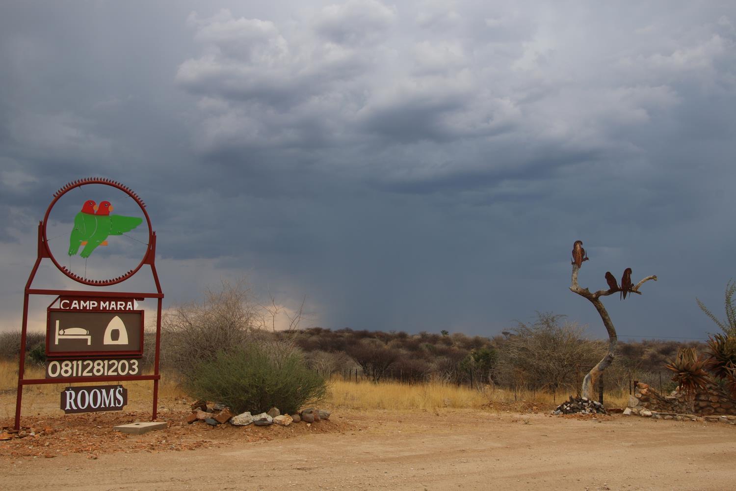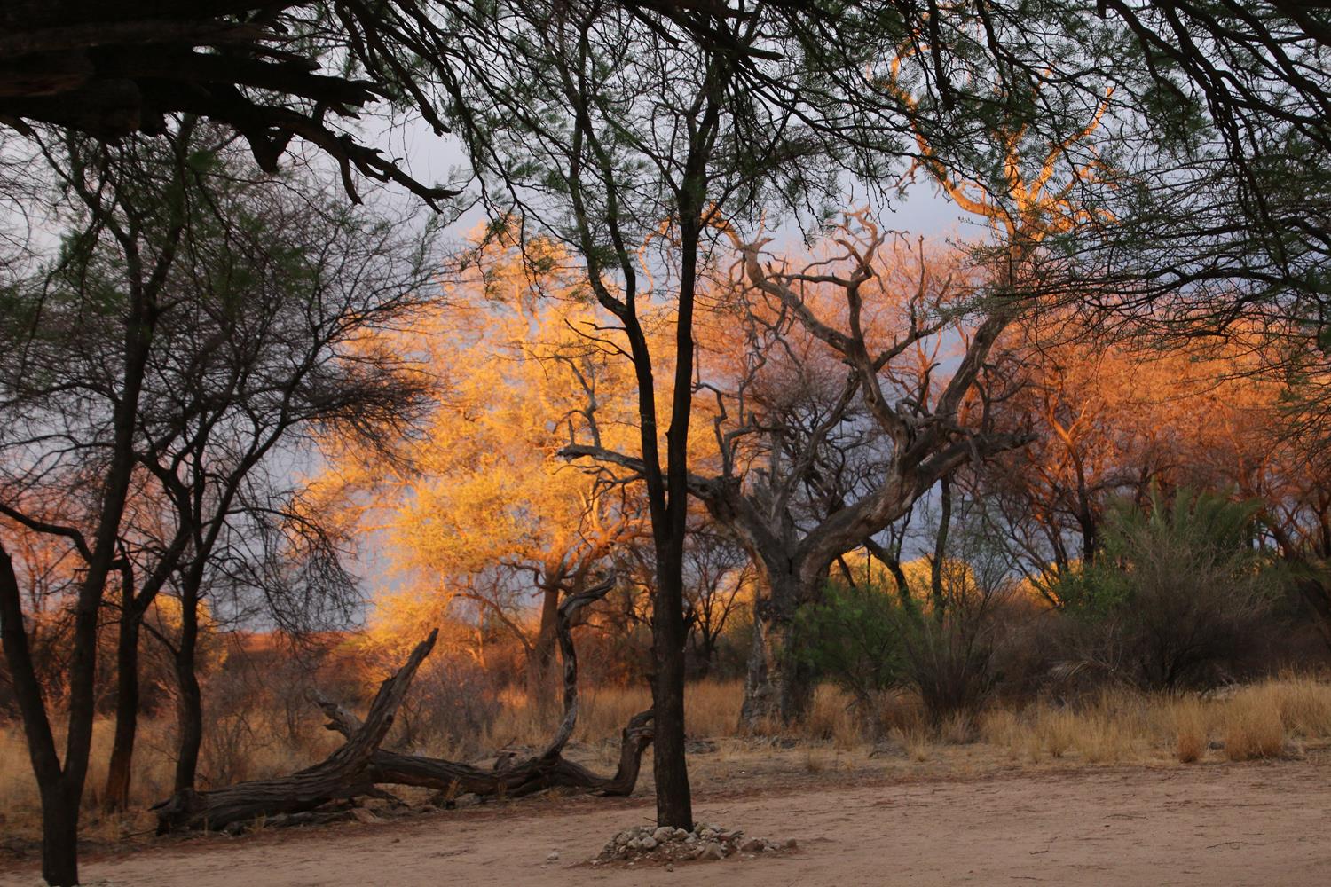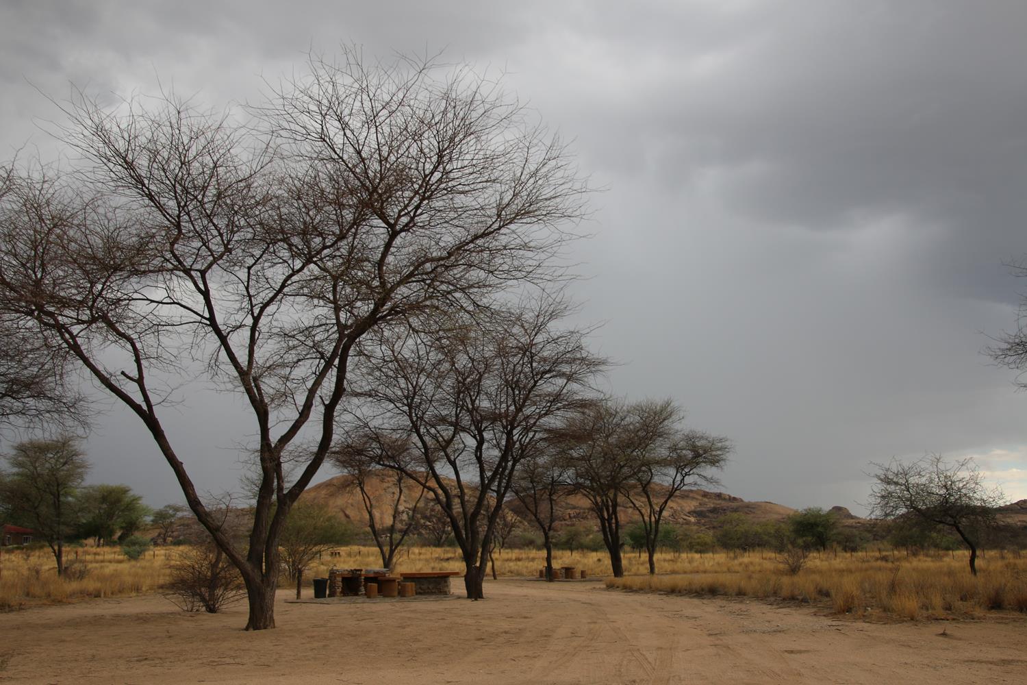 Nous trouvons un camp « camp Mara» Magnifique, niché dans des arbres, entouré de savane, nous admirons silencieux un coucher de soleil extraordinaire. Une antilope nous regarde à quelques mètres, les oiseaux vont d’arbres en arbres, c’est magique. Dans la nuit, un grand coup de tonnerre, peut-être de la pluie à venir car toujours rien malgré les gros nuages noirs. Les éclairs éclairent le ciel de tous les côtés, elles sont blanches mais nous en voyons une à plusieurs branches rouge comme de la braise, et c’est vrai on a pas fumé la moquette !. Quelques gouttes de pluie et c’est fini. Nous restons une nuit de plus pour aller crapahuter dans la montagne et visiter Omaruru.