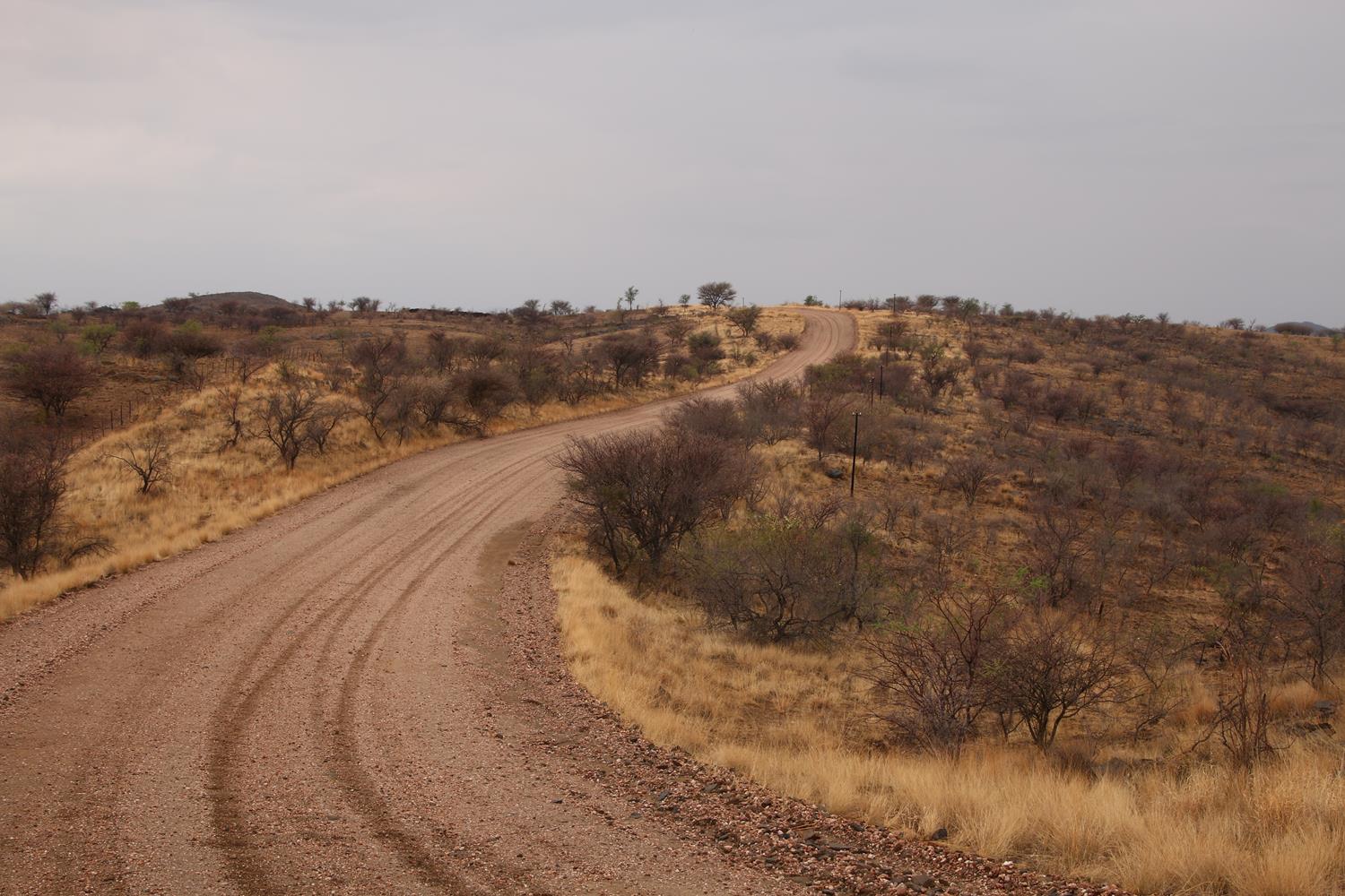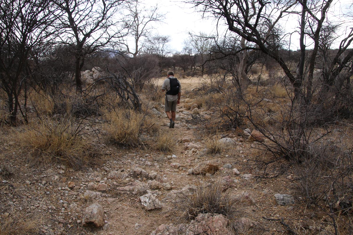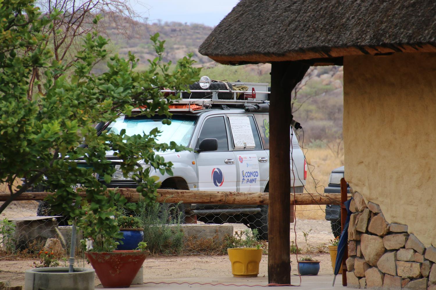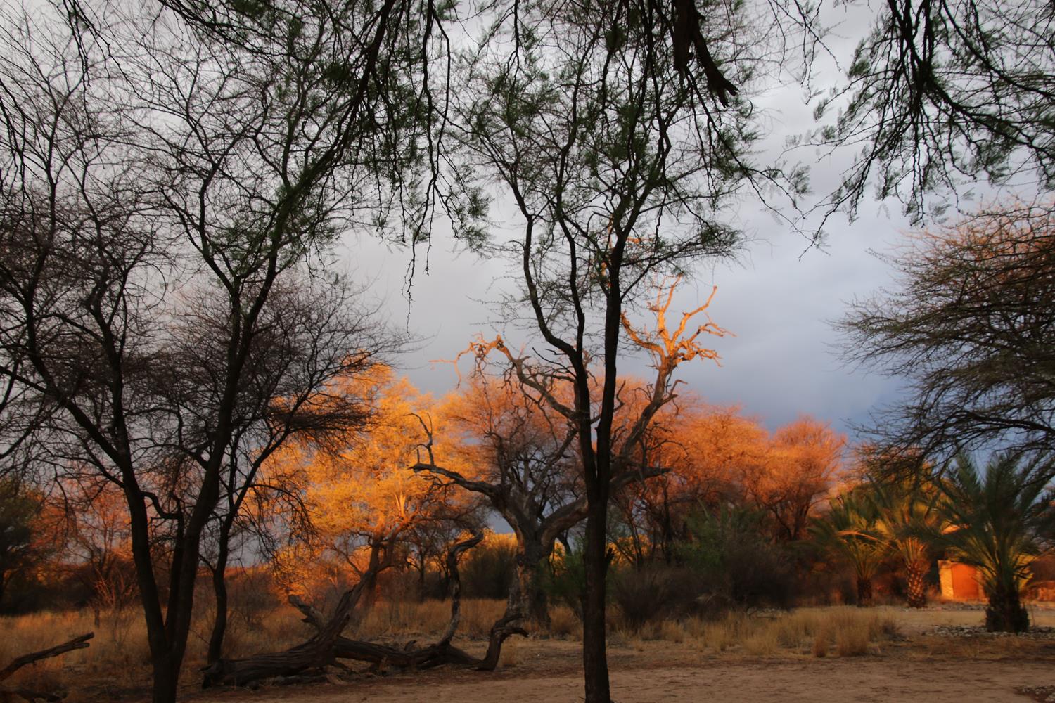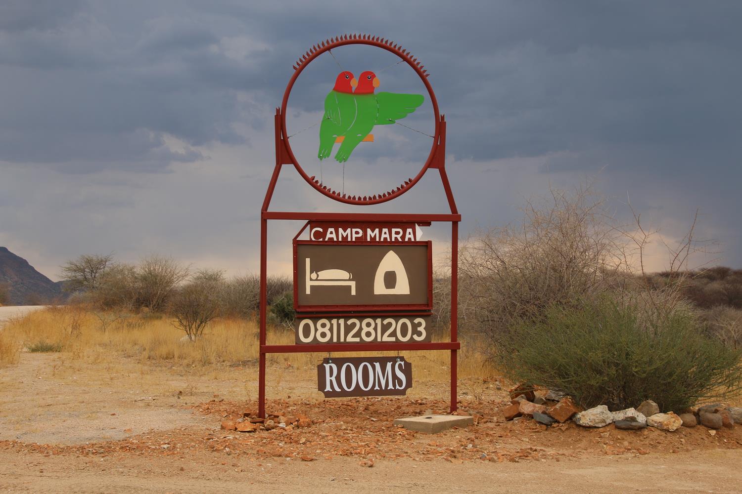 Nous trouvons un camp « camp Mara» Magnifique, niché dans des arbres, entouré de savane, nous admirons silencieux un coucher de soleil extraordinaire. Une antilope nous regarde à quelques mètres, les oiseaux vont d’arbres en arbres, c’est magique. Dans la nuit, un grand coup de tonnerre, peut-être de la pluie à venir car toujours rien malgré les gros nuages noirs. Les éclairs éclairent le ciel de tous les côtés, elles sont blanches mais nous en voyons une à plusieurs branches rouge comme de la braise, et c’est vrai on a pas fumé la moquette !. Quelques gouttes de pluie et c’est fini. Nous restons une nuit de plus pour aller crapahuter dans la montagne et visiter Omaruru.