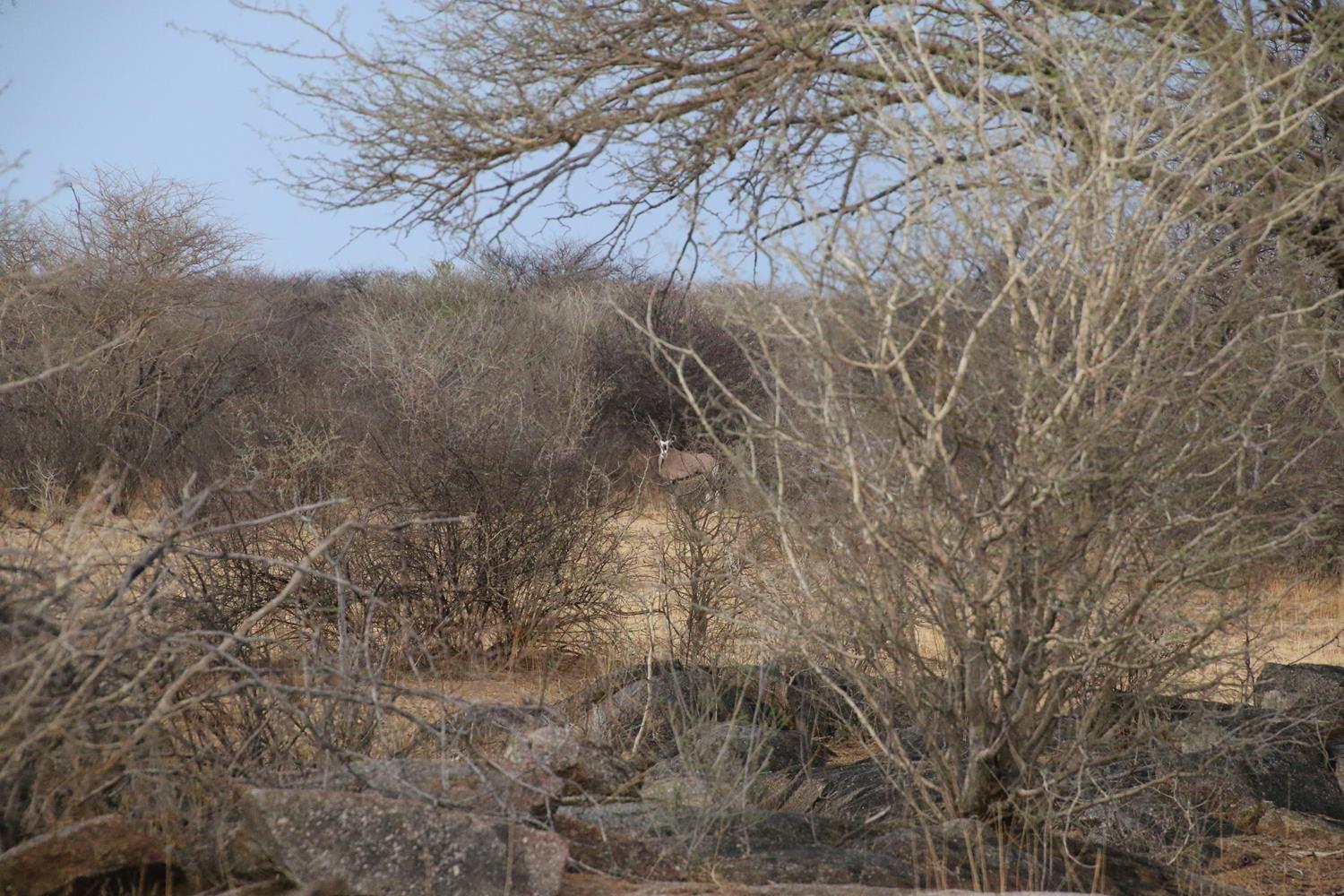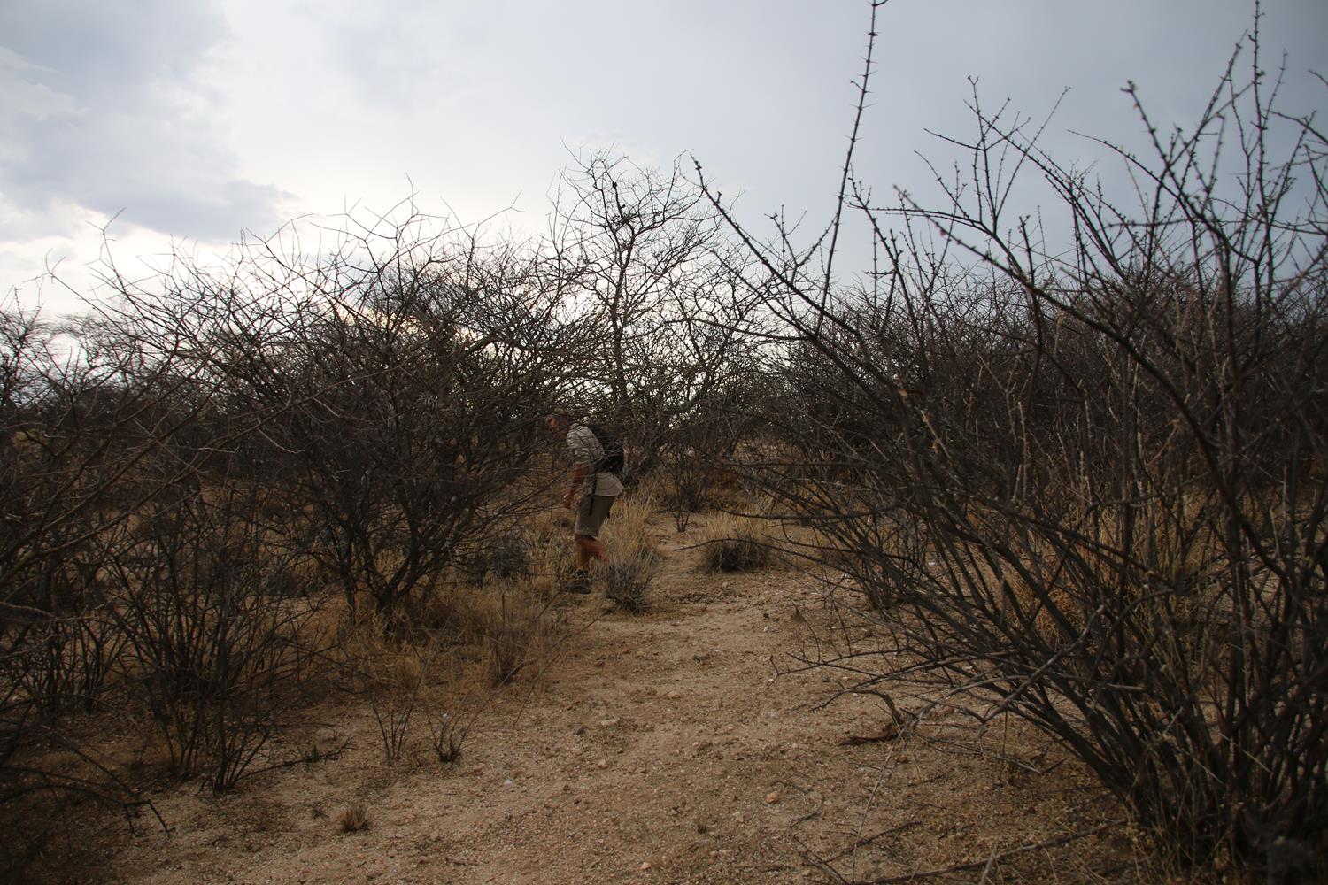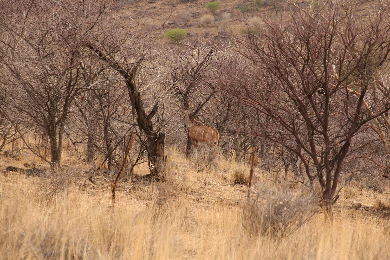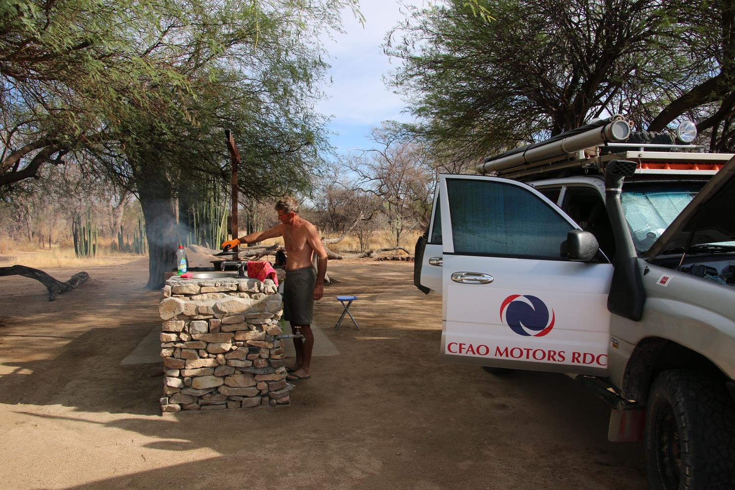 Nous trouvons un camp « camp Mara» Magnifique, niché dans des arbres, entouré de savane, nous admirons silencieux un coucher de soleil extraordinaire. Une antilope nous regarde à quelques mètres, les oiseaux vont d’arbres en arbres, c’est magique. Dans la nuit, un grand coup de tonnerre, peut-être de la pluie à venir car toujours rien malgré les gros nuages noirs. Les éclairs éclairent le ciel de tous les côtés, elles sont blanches mais nous en voyons une à plusieurs branches rouge comme de la braise, et c’est vrai on a pas fumé la moquette !. Quelques gouttes de pluie et c’est fini. Nous restons une nuit de plus pour aller crapahuter dans la montagne et visiter Omaruru.