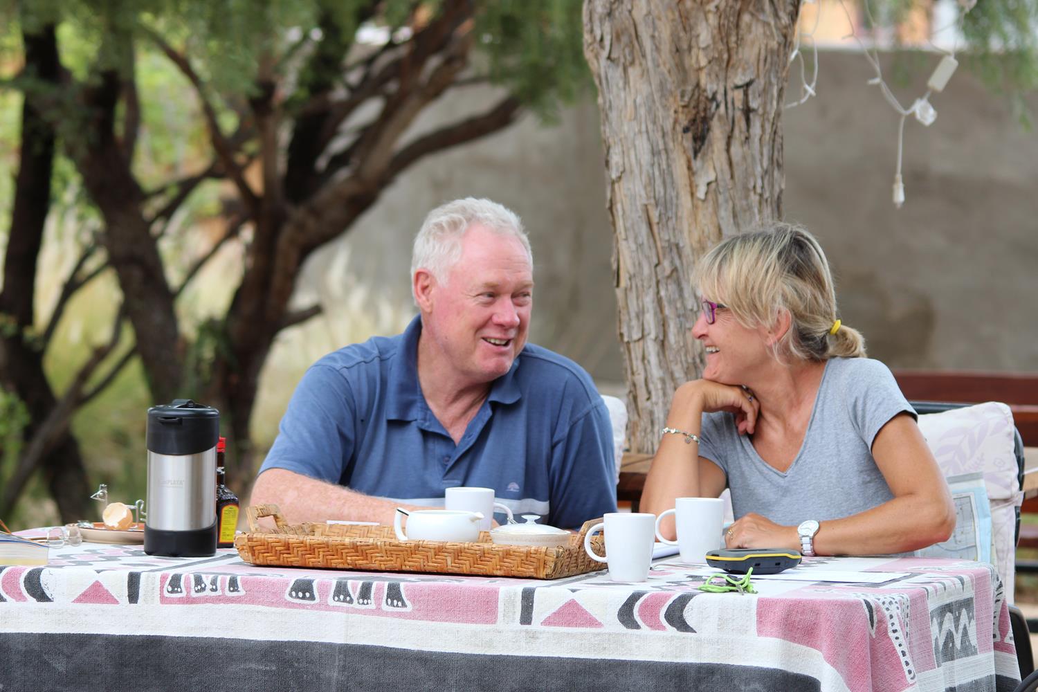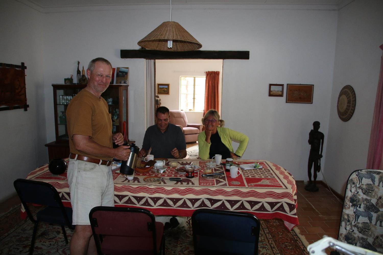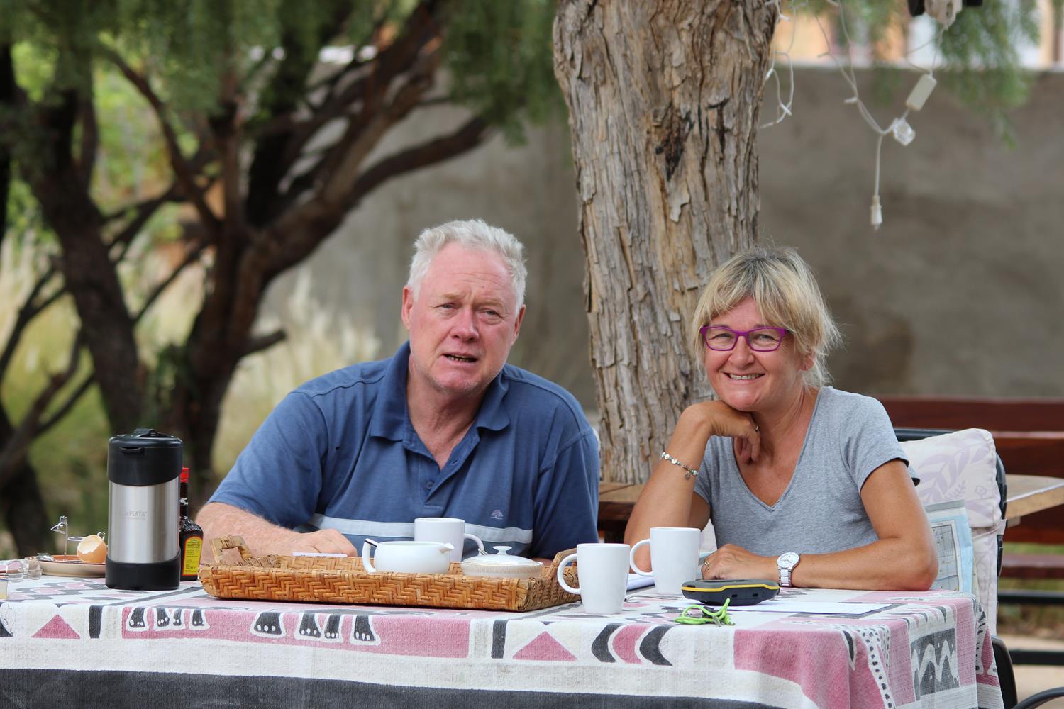 Avant d’arrivée à Windhoek, nous nous arrêtons pour camper au bord de la piste. J’avais bien vu une pancarte qui disait ne pas dormir dans la voiture etc…mais elle était très délavée. 4 voitures passent avec des grands signes et beaux sourires ( blancs et noirs) mais la cinquième, un blanc, avec femme et enfants affublés de chapeaux de cow-boy s’arrête ça change de musique . Pas de bonsoir, encore moins de welcome, il vocifère » NO CAMP HERE » trois fois de suite ! ok ça va papa , on est pas doué en anglais mais on comprend. nous finissons notre dîner tranquillement et décidons de décamper , quel C.. alors. Nous sommes à 70 km de Windhoek . A 20 Kms nous apercevons une pancarte « Daan Viljoen Camp » il fait nuit, donc aucune hésitation on se pose. Très chouette accueil et super beau camp . Le lendemain matin, belle rencontre avec Chantal et Yves , 2 franco/suisses en fin de vacances. Dommage que nous n’ayons pas eu le temps de passer un peu plus de temps ensemble.