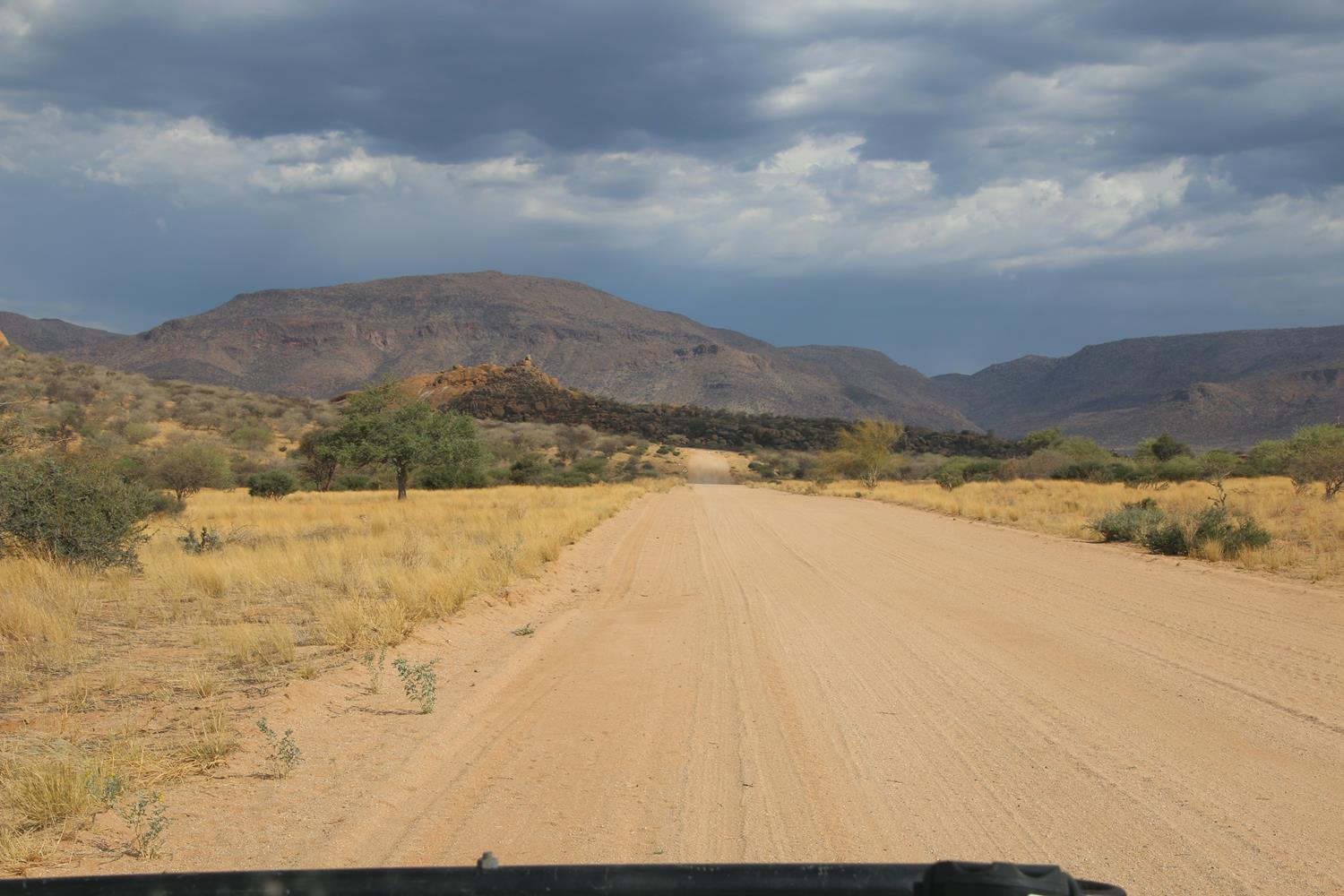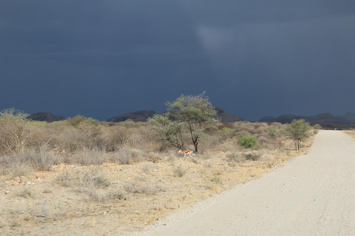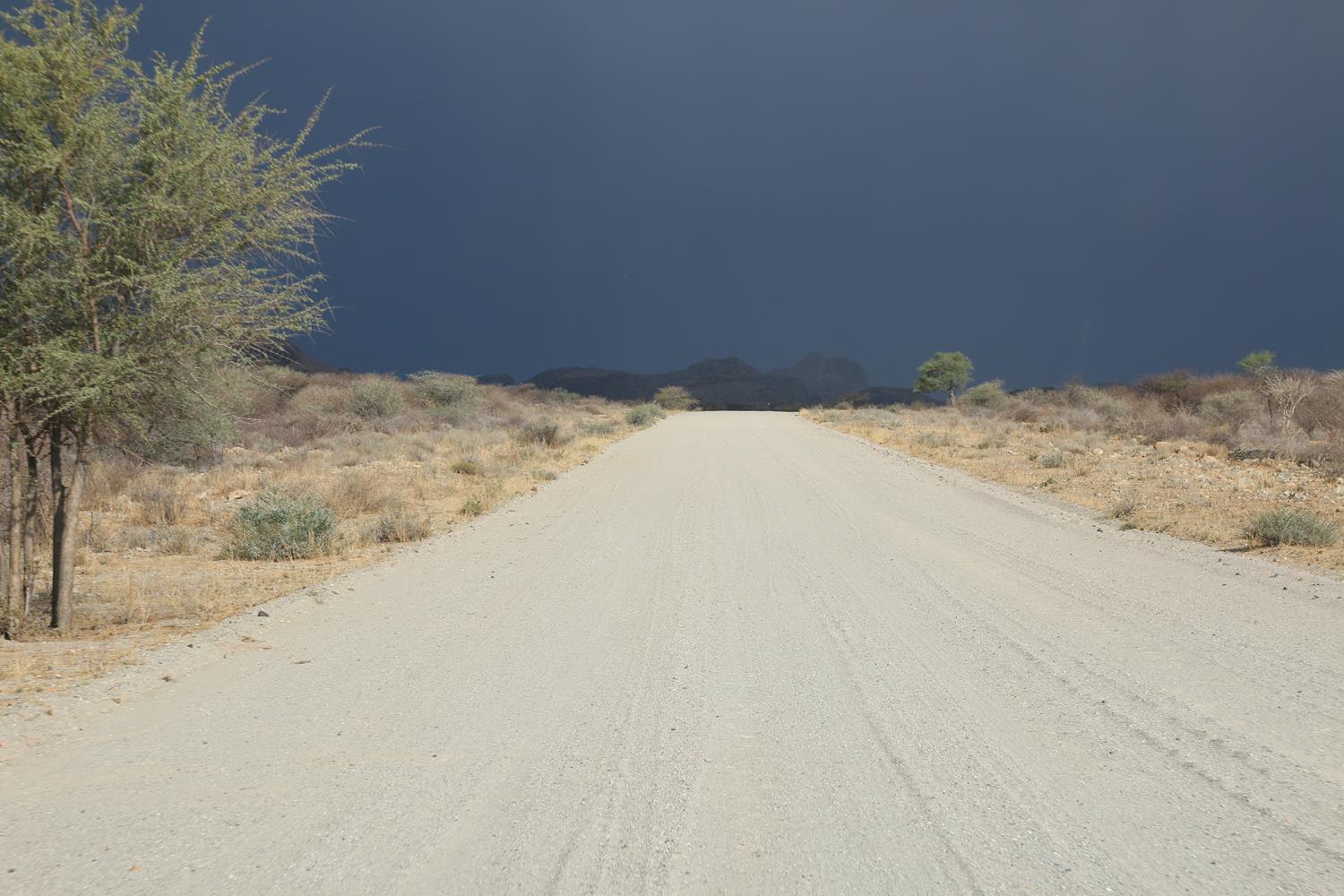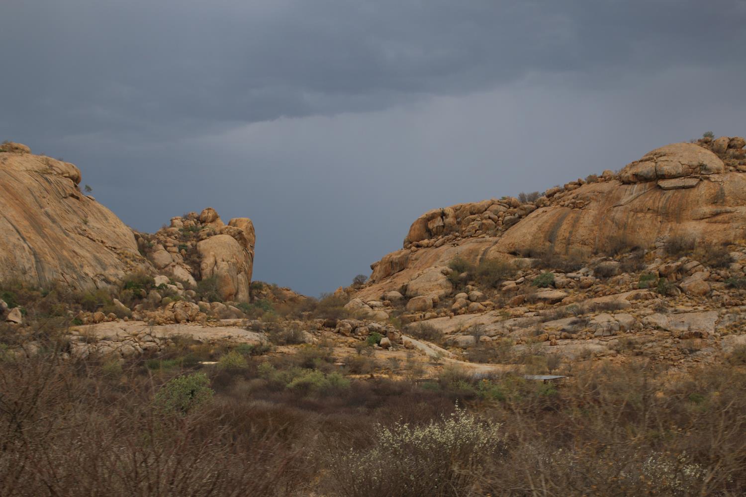 Yann voit une belle montagne à la sortie du Spitzkoppe, changement d’itinéraire et en avant vers le nord en direction d’Omururu. Excellente idée, la piste et le paysage sont fabuleux et en plus un orage se prépare, enfin de la pluie (pas vu une goutte depuis le 8 novembre).