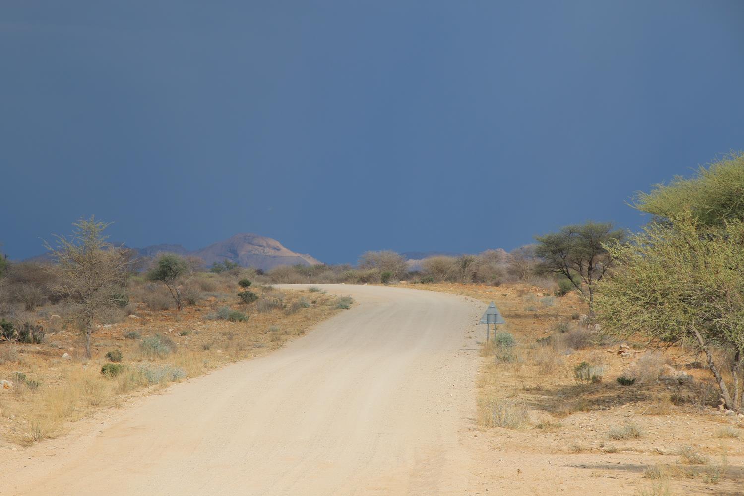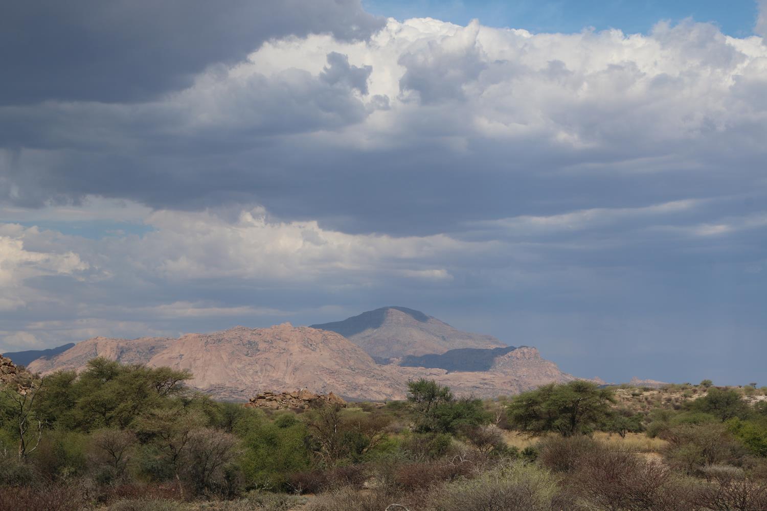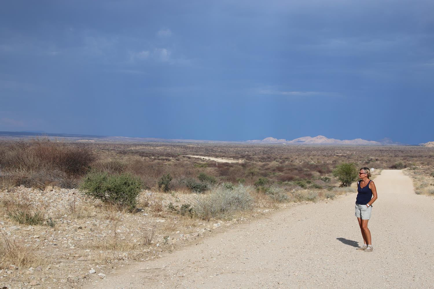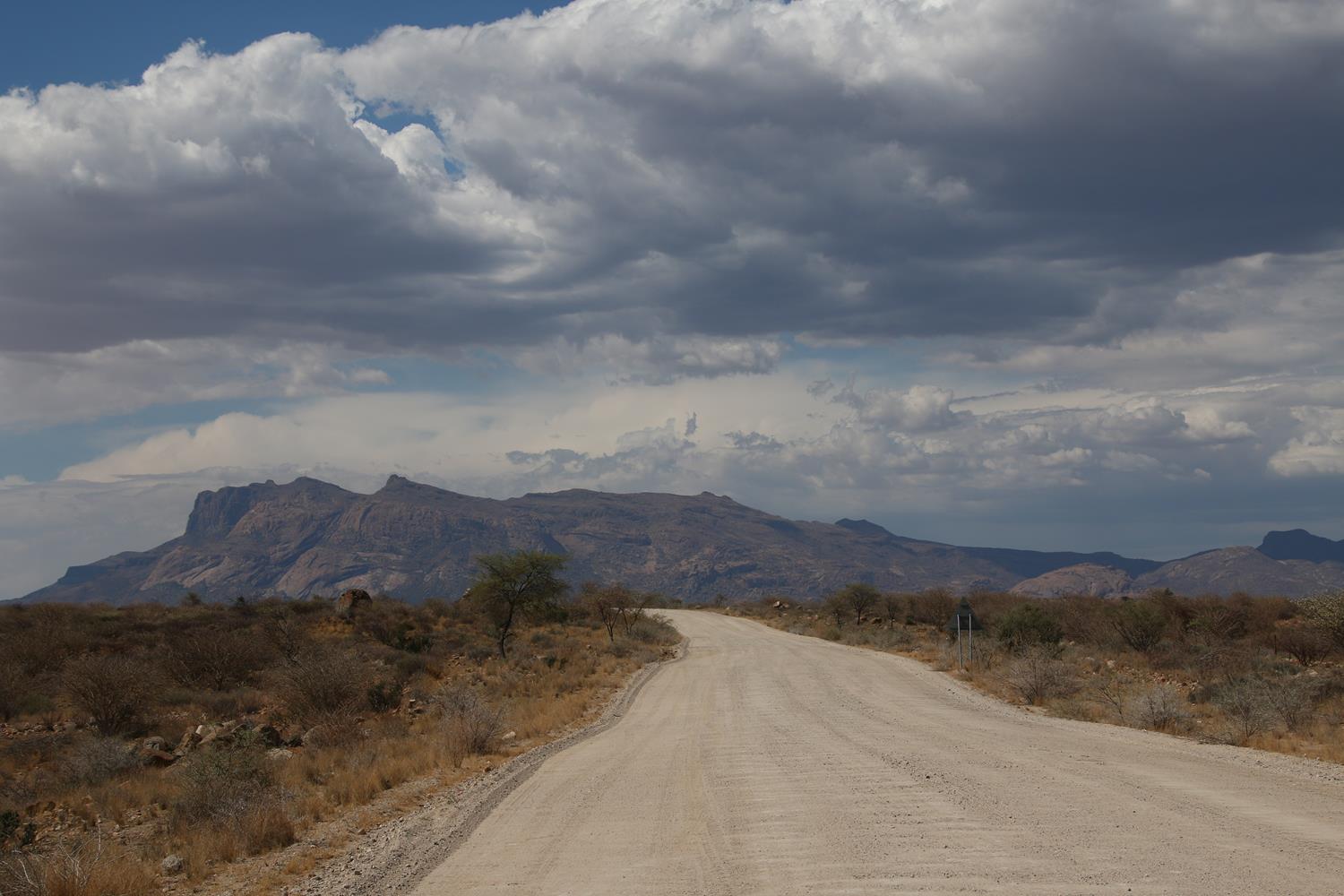 Yann voit une belle montagne à la sortie du Spitzkoppe, changement d’itinéraire et en avant vers le nord en direction d’Omururu. Excellente idée, la piste et le paysage sont fabuleux et en plus un orage se prépare, enfin de la pluie (pas vu une goutte depuis le 8 novembre).