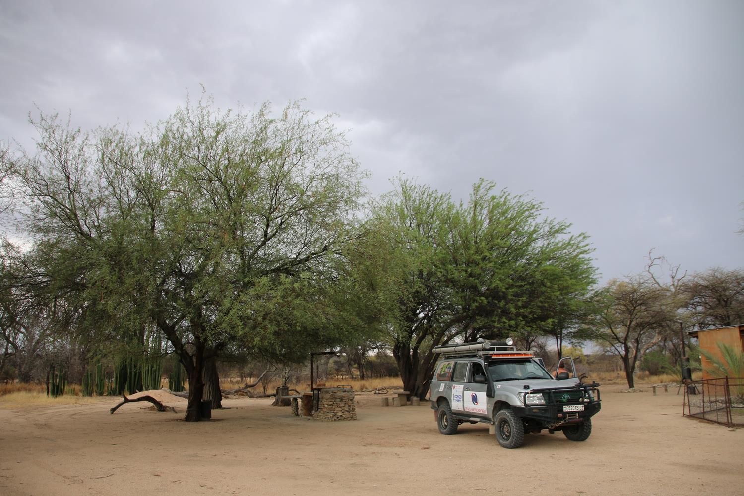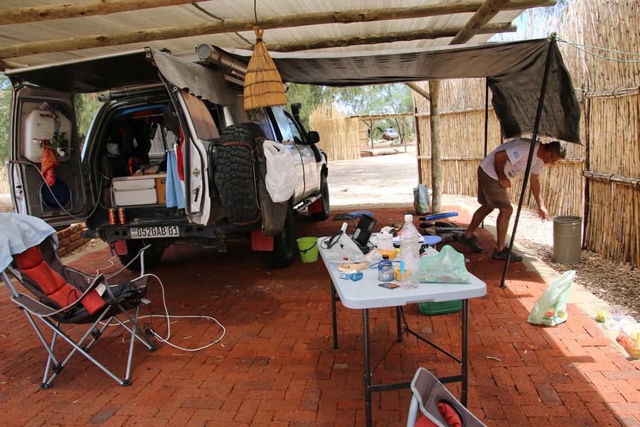 9 décembre: Départ pour Windhoek. La capitale est jolie petite et assez calme. Nous cherchons un guest house mais la vue des murs et des clôtures électriques nous rebute. Nous trouvons un camp très sympa qui fera l’affaire. La 1ere soirée est sous la pluie et nous sommes les seuls à diner dehors sous la super bâche de Yann. Nous regardons, un peu amusés, tous les touristes courir à droite et à gauche …