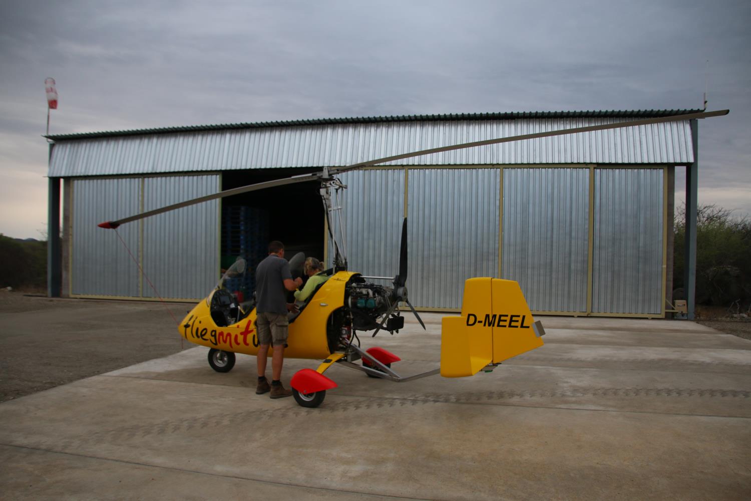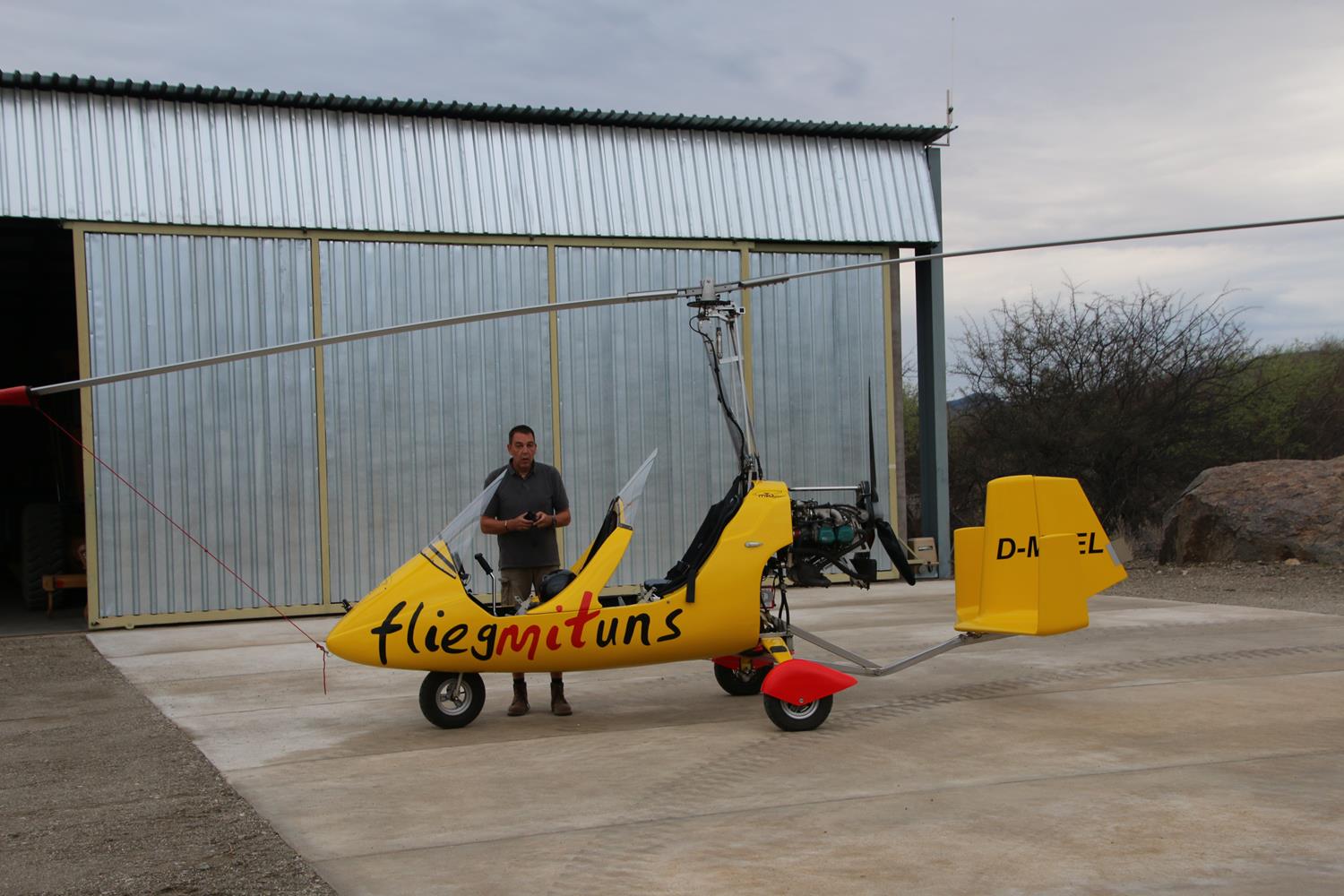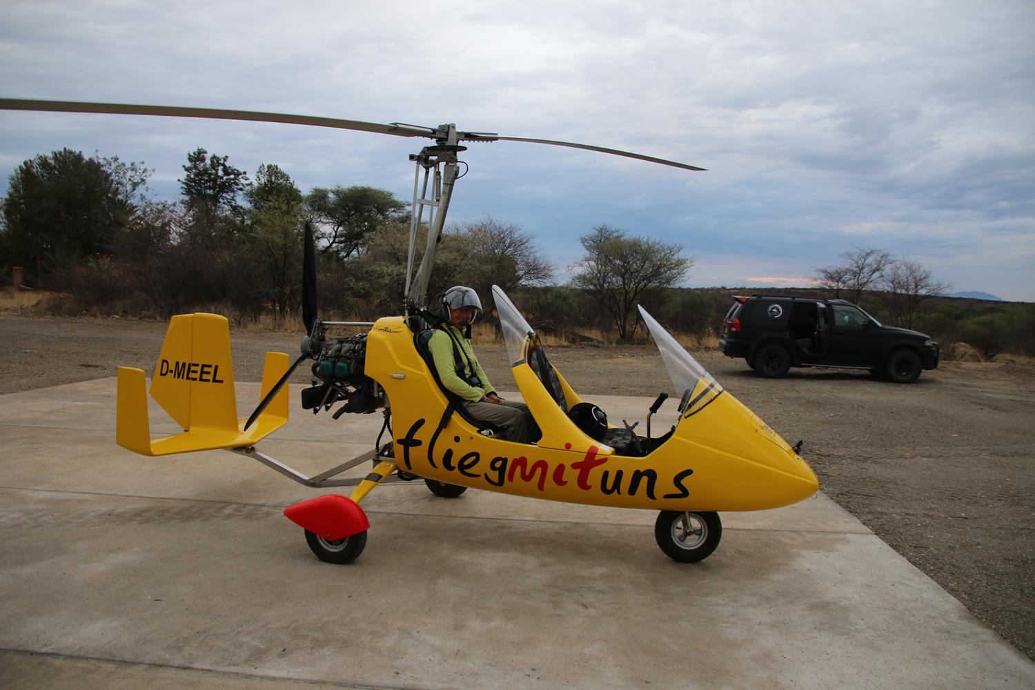 Avant notre balade dans la montagne ( pas de photos ça n’était pas terrible) , nous faisons plus connaissance avec les propriétaires du Camp Ecki Meyer et Stefan Hafhan. Nous passons un bon moment autour d’un café avec Ecki qui nous aide à trouver un réparateur pour le panel solar. Après vérification du pilote, cela sera juste un mauvais contact du à une oxydation. Au cours de la conversation, il nous parle de la passion de Stefan avec le Gyrocopter et nous propose de faire un tour le lendemain (s’il ne pleut pas) Of course ! Ecki nous dit aussi que la balade que nous avons fait hier soir dans le bush n’était pas autorisée car nous étions chez son voisin . Aucun risque de croiser un lion mais avoir du plomb dans les fesses oui !!! c’est un chasseur et il n’aime pas les intrus !