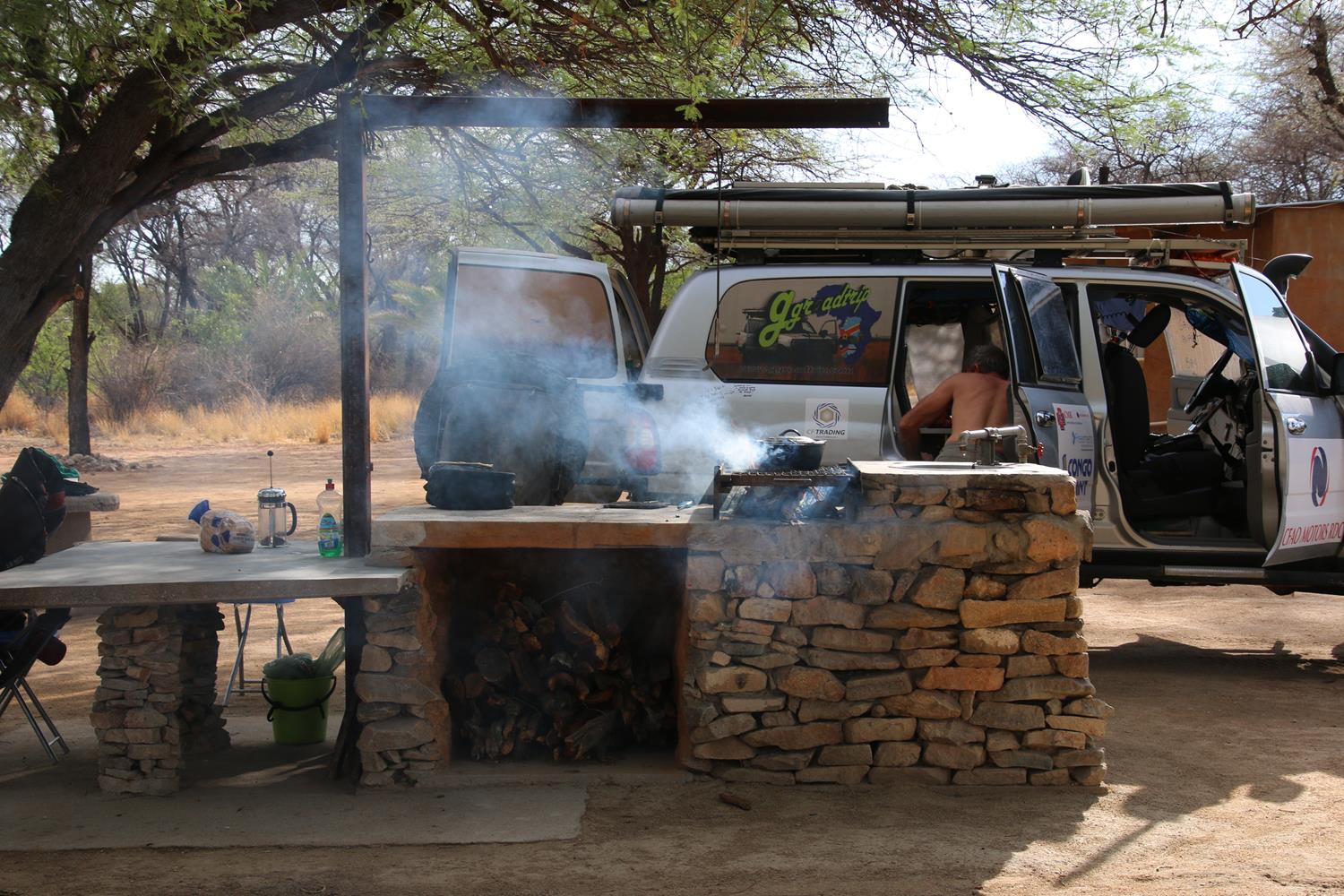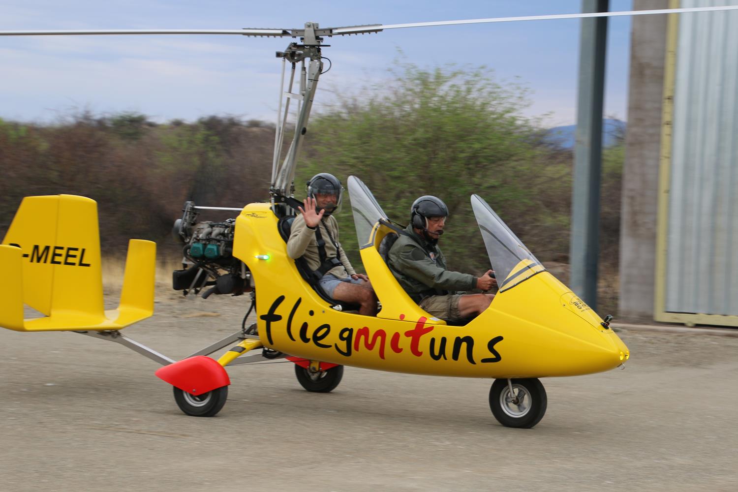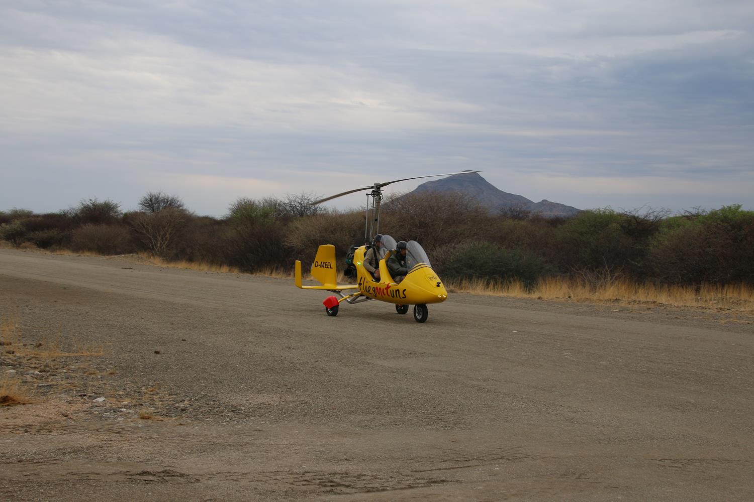 Avant notre balade dans la montagne ( pas de photos ça n’était pas terrible) , nous faisons plus connaissance avec les propriétaires du Camp Ecki Meyer et Stefan Hafhan. Nous passons un bon moment autour d’un café avec Ecki qui nous aide à trouver un réparateur pour le panel solar. Après vérification du pilote, cela sera juste un mauvais contact du à une oxydation. Au cours de la conversation, il nous parle de la passion de Stefan avec le Gyrocopter et nous propose de faire un tour le lendemain (s’il ne pleut pas) Of course ! Ecki nous dit aussi que la balade que nous avons fait hier soir dans le bush n’était pas autorisée car nous étions chez son voisin . Aucun risque de croiser un lion mais avoir du plomb dans les fesses oui !!! c’est un chasseur et il n’aime pas les intrus !