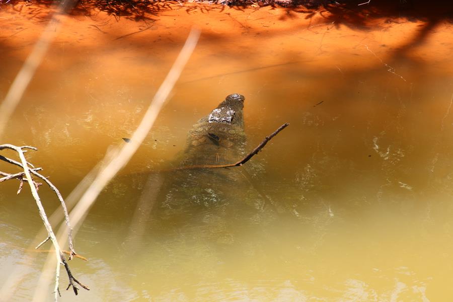 Soudain je lui montre un petit bout de bois qui bouge !! Je pointe le zoom et oui c’est bien ça, un beau gaillard à la surface de l’eau, immobile. Alors alors … M. Yannick…. Nous continuons et quelques mètres plus loin Yann me dit, « Bon sang, gg regarde ! » Et là un mastodonte qui sort de l’eau, à la verticale, pour attraper un morceau de viande accrocher dans une branche.